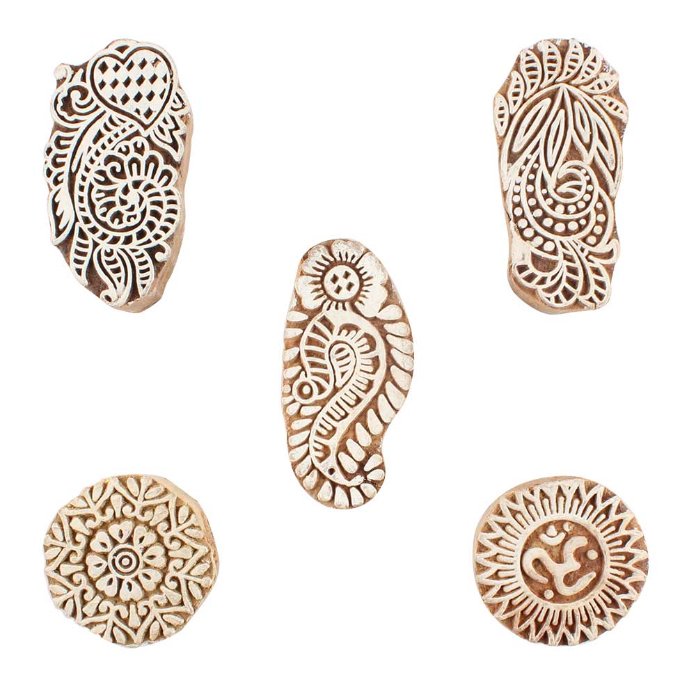 Set of 5 Piece New Mix Wooden Printing Blocks. Ideal for use on Fabric, Paper, Canvas, etc. These Blocks can be use to Print with Oil Colors, Fabric Colors, Water Colors, Acrylic Colors and Vegetable Colors.