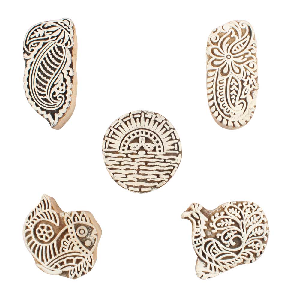 Set of 5 Piece New Mix Wooden Printing Blocks. Ideal for use on Fabric, Paper, Canvas, etc. These Blocks can be use to Print with Oil Colors, Fabric Colors, Water Colors, Acrylic Colors and Vegetable Colors.