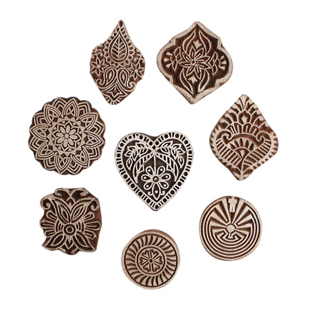 Set of 8 Piece New Mix Wooden Printing Block. Ideal for Using on Fabric, Paper, Canvas, etc. These Blocks can be use to Print with Oil Colors, Fabric Colors, Water Colors, Acrylic Colors and Vegetable Colors.