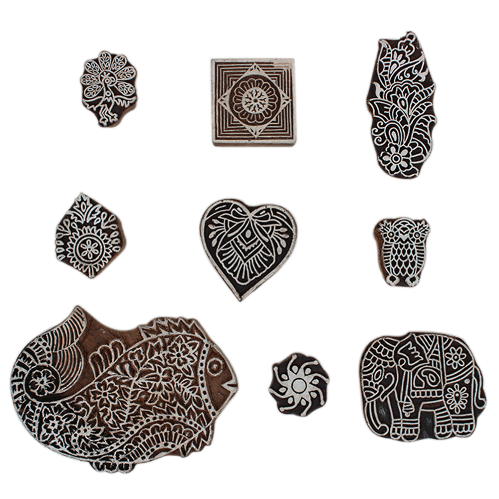 Set of 9 Piece New Mix Wooden Printing Block. Ideal for Using on Fabric, Paper, Canvas, etc. These Blocks can be use to Print with Oil Colors, Fabric Colors, Water Colors, Acrylic Colors and Vegetable Colors.