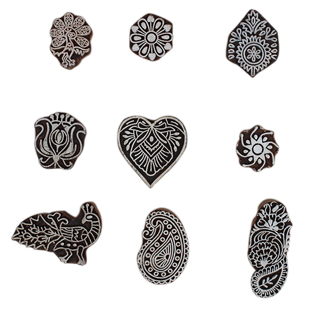 Set of 9 Piece New Mix Wooden Printing Block. Ideal for Using on Fabric, Paper, Canvas, etc. These Blocks can be use to Print with Oil Colors, Fabric Colors, Water Colors, Acrylic Colors and Vegetable Colors.