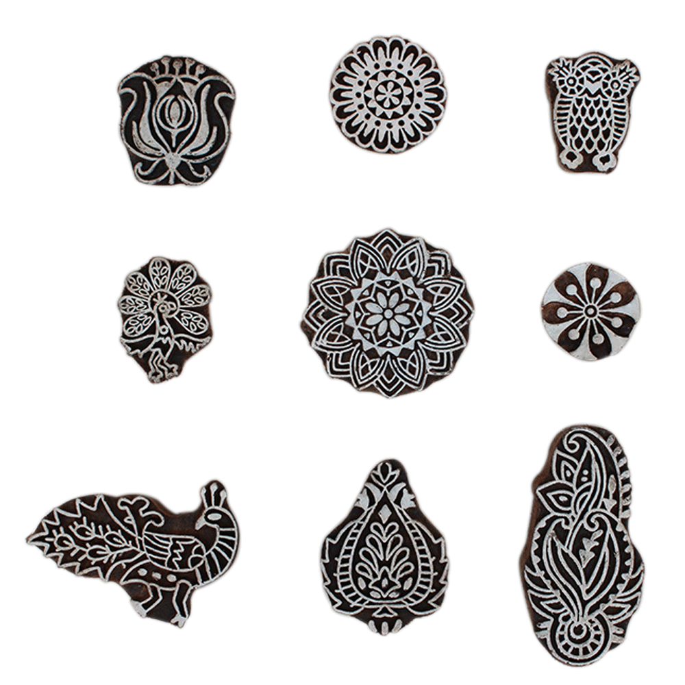 Set of 9 Piece New Mix Wooden Printing Block. Ideal for Using on Fabric, Paper, Canvas, etc. These Blocks can be use to Print with Oil Colors, Fabric Colors, Water Colors, Acrylic Colors and Vegetable Colors.