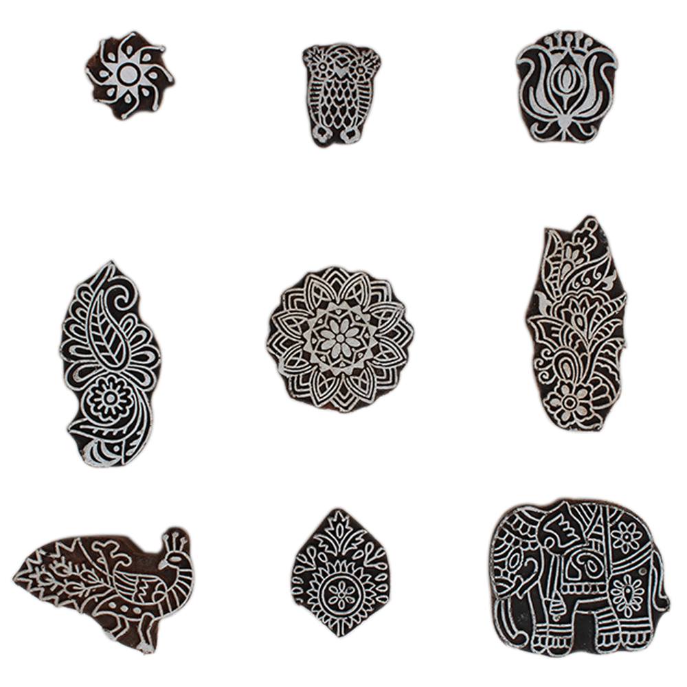 Set of 9 Piece New Mix Wooden Printing Block. Ideal for Using on Fabric, Paper, Canvas, etc. These Blocks can be use to Print with Oil Colors, Fabric Colors, Water Colors, Acrylic Colors and Vegetable Colors.