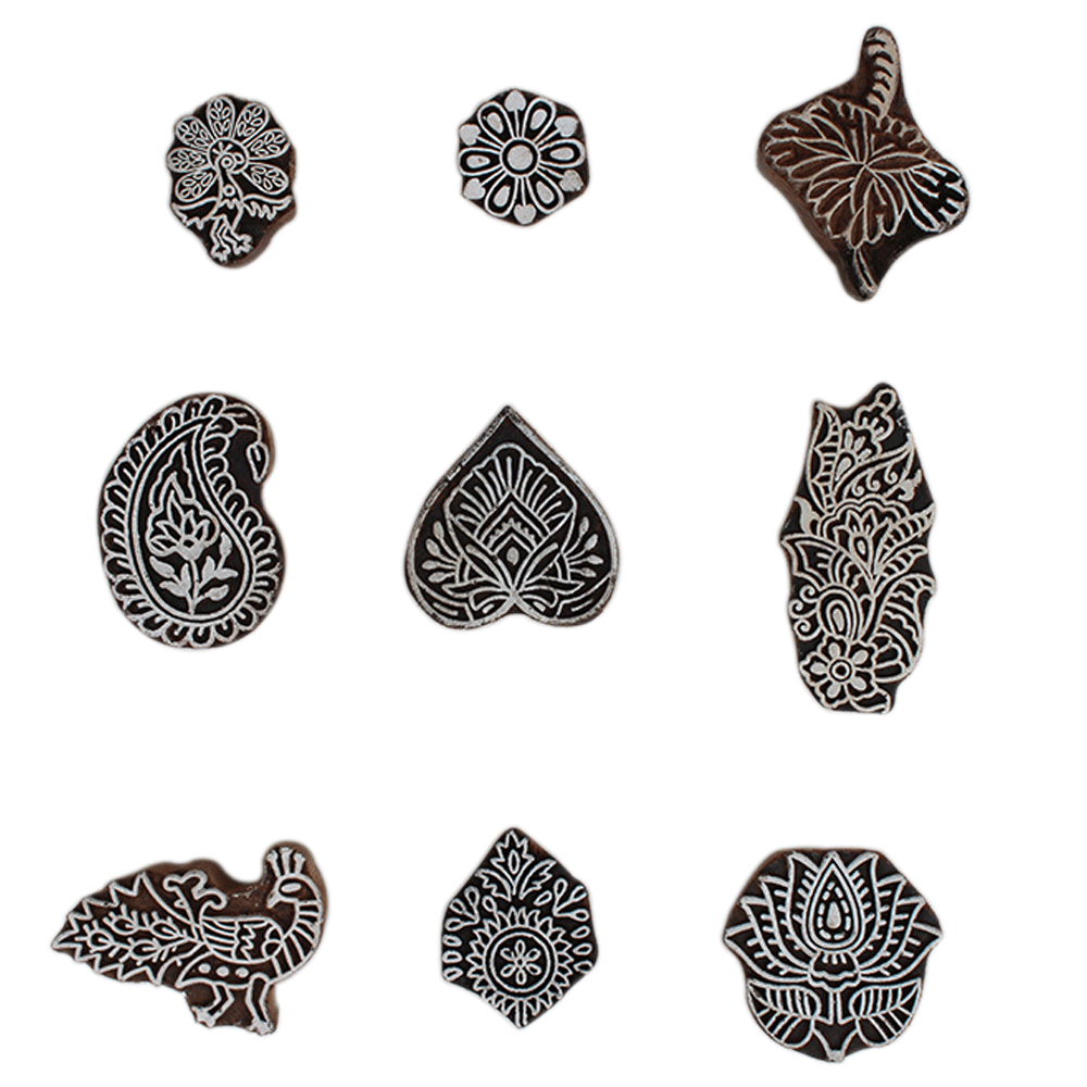 Set of 9 Piece New Mix Wooden Printing Block. Ideal for Using on Fabric, Paper, Canvas, etc. These Blocks can be use to Print with Oil Colors, Fabric Colors, Water Colors, Acrylic Colors and Vegetable Colors.