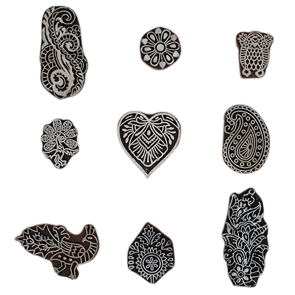 Set of 9 Piece New Mix Wooden Printing Block. Ideal for Using on Fabric, Paper, Canvas, etc. These Blocks can be use to Print with Oil Colors, Fabric Colors, Water Colors, Acrylic Colors and Vegetable Colors.