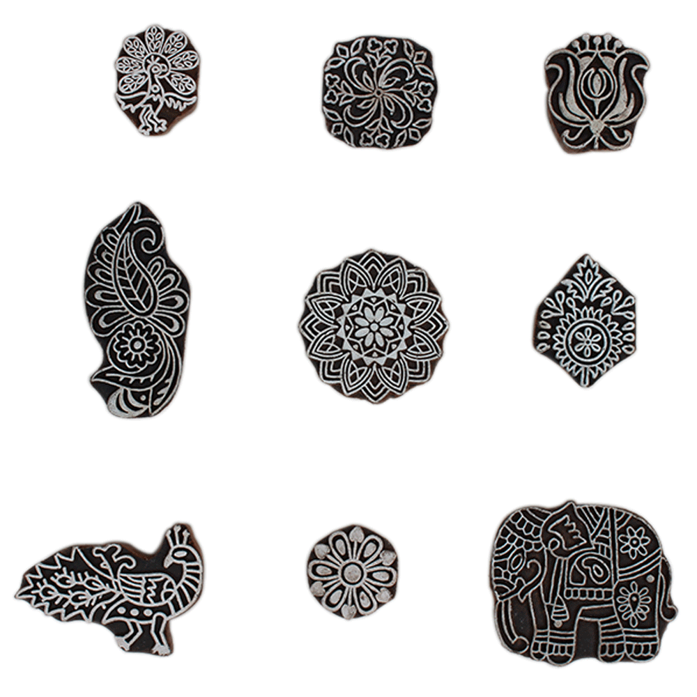 Set of 9 Piece New Mix Wooden Printing Block. Ideal for Using on Fabric, Paper, Canvas, etc. These Blocks can be use to Print with Oil Colors, Fabric Colors, Water Colors, Acrylic Colors and Vegetable Colors.