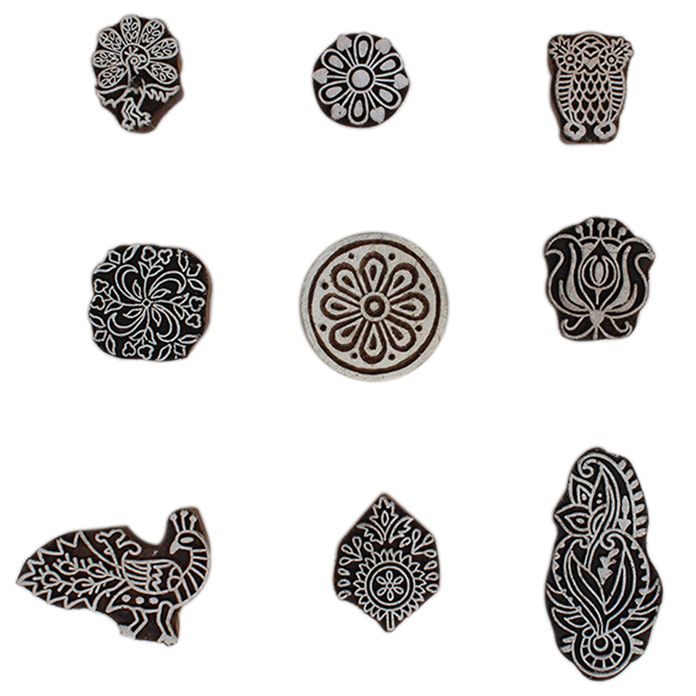 Set of 9 Piece New Mix Wooden Printing Block. Ideal for Using on Fabric, Paper, Canvas, etc. These Blocks can be use to Print with Oil Colors, Fabric Colors, Water Colors, Acrylic Colors and Vegetable Colors.
