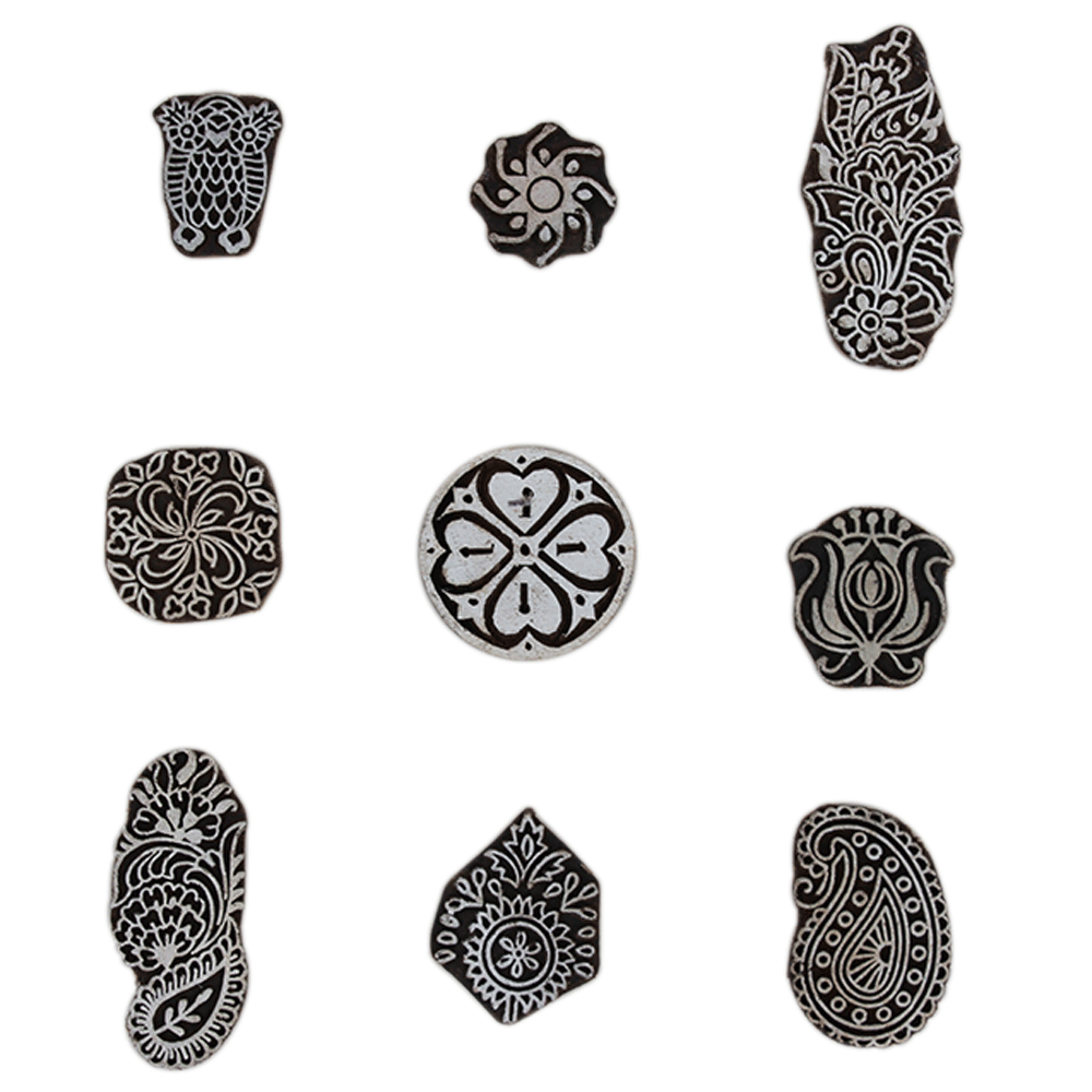 Set of 9 Piece New Mix Wooden Printing Block. Ideal for Using on Fabric, Paper, Canvas, etc. These Blocks can be use to Print with Oil Colors, Fabric Colors, Water Colors, Acrylic Colors and Vegetable Colors.