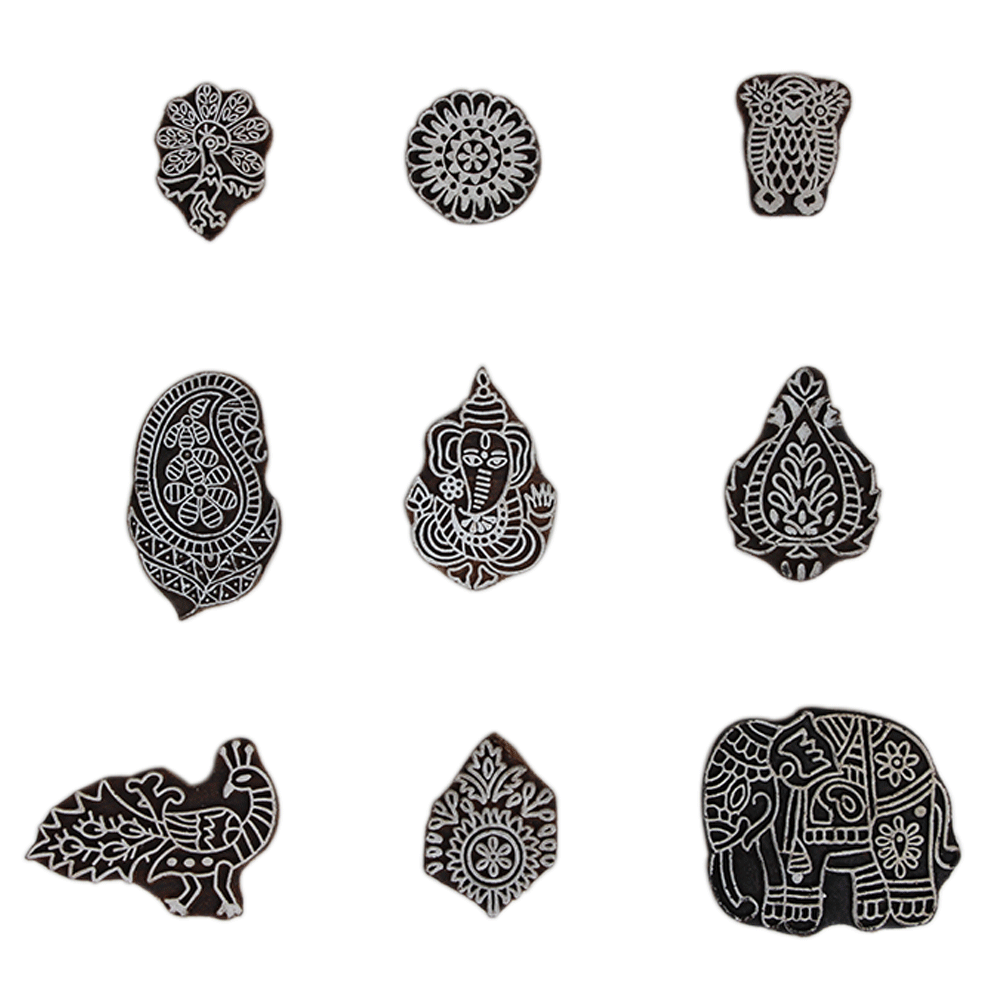 Set of 9 Piece New Mix Wooden Printing Block. Ideal for Using on Fabric, Paper, Canvas, etc. These Blocks can be use to Print with Oil Colors, Fabric Colors, Water Colors, Acrylic Colors and Vegetable Colors.