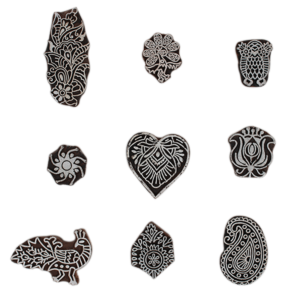 Set of 9 Piece New Mix Wooden Printing Block. Ideal for Using on Fabric, Paper, Canvas, etc. These Blocks can be use to Print with Oil Colors, Fabric Colors, Water Colors, Acrylic Colors and Vegetable Colors.