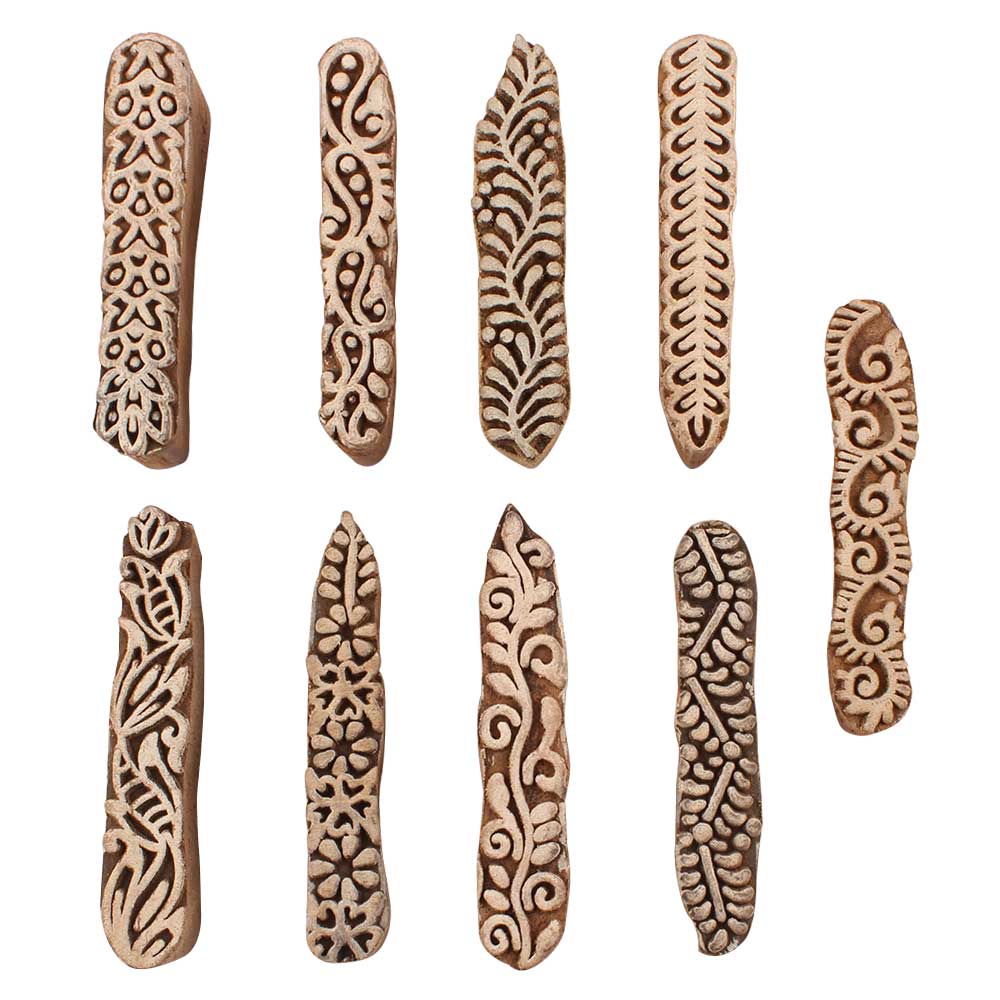 Set of 9 Piece New Mix Wooden Printing Blocks. Ideal for use on Fabric, Paper, Canvas, etc. These Blocks can be use to Print with Oil Colors, Fabric Colors, Water Colors, Acrylic Colors and Vegetable Colors.