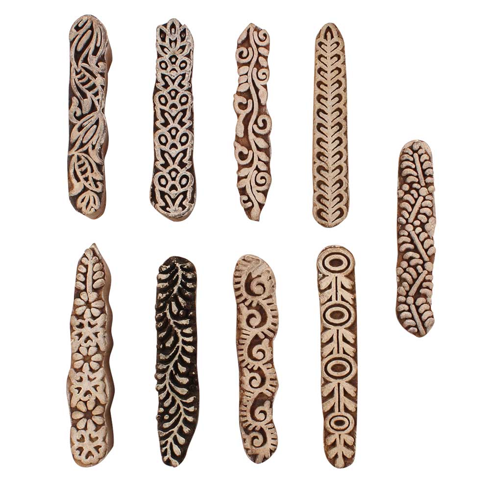 Set of 9 Piece New Mix Wooden Printing Blocks. Ideal for use on Fabric, Paper, Canvas, etc. These Blocks can be use to Print with Oil Colors, Fabric Colors, Water Colors, Acrylic Colors and Vegetable Colors.