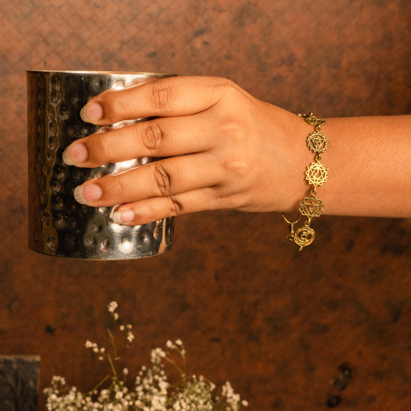 This Seven Chakra Charms Bracelet beautifully blends spiritual symbolism with handcrafted elegance. Made from premium brass and finished with a soft 14K gold-plated shine, the bracelet features seven meaningful chakra charms designed to inspire balance, alignment, and emotional well-being. At 6.5 inches with a comfortable fit, this artisan-made bracelet offers a mindful accessory for women who appreciate both beauty and deeper intention.