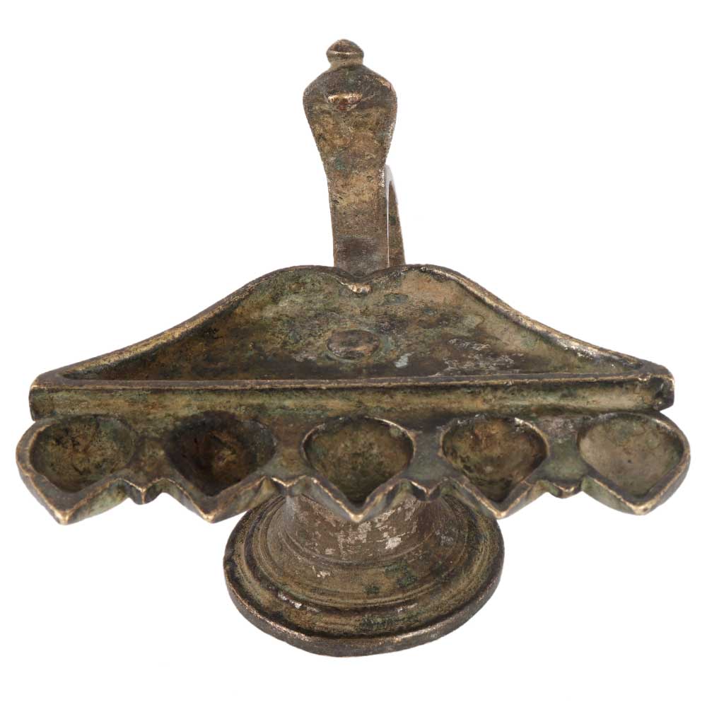Sheshnaag snake aarti diya is very well-crafted by master craftsmen of india.  A very auspicious item to give to someone. This is a brass diya oil lamp. It appears to be attractive and ethnically diverse.  This 5 batti aarti with kapur daan is used during worship in home mandir and temples.