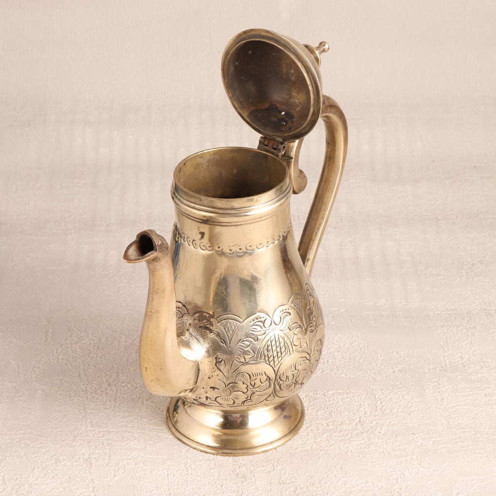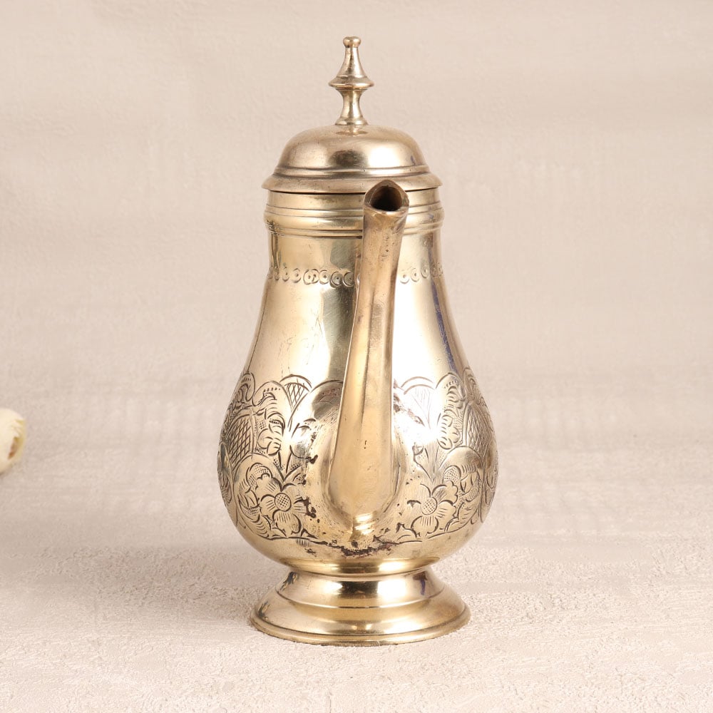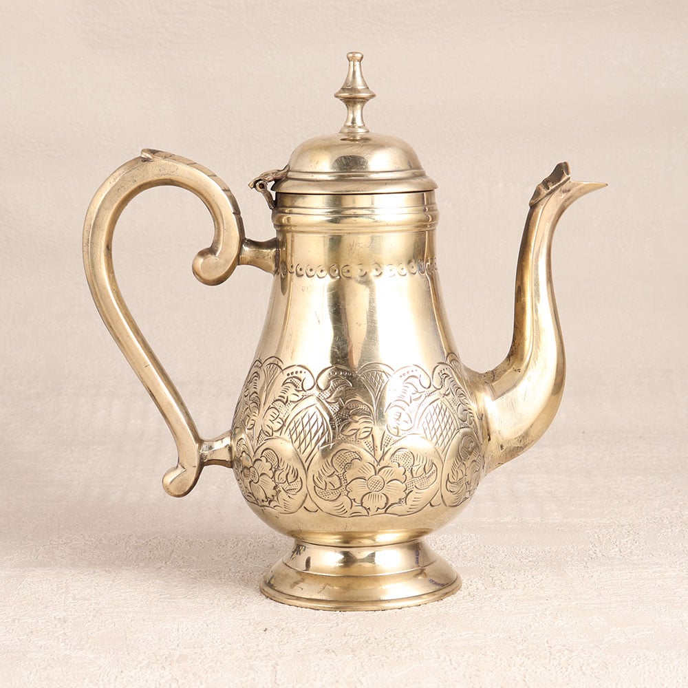 Adorn your home interior with this exquisite white Brass tea kettle that is a true masterpiece of craftsmanship. Handmade by highly skilled Indian artisans using traditional English Art techniques, this stunning piece is a testament to their expertise and dedication. Its gleaming golden finish adds a touch of opulence to any setting, making it a versatile choice for your home, office, hotel, cafe, shop, or restaurant. This tea kettle is not just a functional kitchen accessory, it's a work of art. Its intricate engraving, elegant handle, spout, and lid combine to create a captivating vintage design that evokes a sense of nostalgia and charm. However, we recommend using it solely for decoration due to its vintage nature, preserving its beauty for years to come. It's a valuable addition to any vintage collection and is perfect for display at exhibitions. This tea kettle also makes a thoughtful gift for your loved ones on special, festive, or auspicious occasions, sharing the elegance and heritage of Indian craftsmanship.