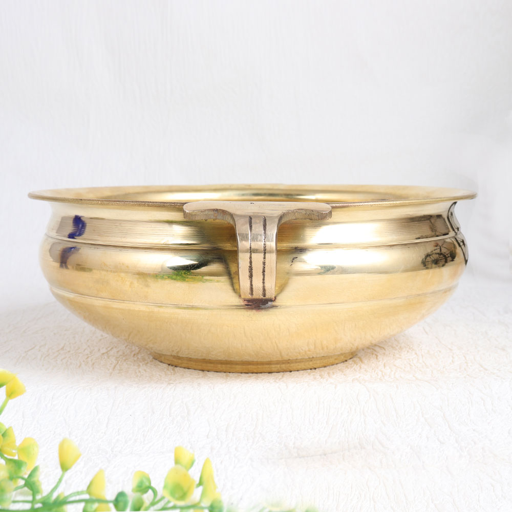 Buy a Brass Urli Pot online that is a true masterpiece handcrafted by talented Indian artisans. This stunning piece boasts a shiny golden finish that radiates opulence and elegance, making it the perfect addition to any setting, be it at home, in an office, restaurant, hotel, cafe, or shop. Crafted from high-quality brass, this Urli pot not only showcases the impeccable craftsmanship of Indian artisans but also ensures durability and longevity. Its classic design features two gracefully curved handles, adding a touch of traditional charm to your space. Versatility is one of the key attributes of this Urli pot. It can be used for both decorative and functional purposes. Fill it with water and let it serve as a captivating centerpiece, allowing vibrant flowers to gracefully float on the surface, creating a serene and enchanting ambiance. Furthermore, our Brass Urli pot makes for an exceptional gift choice for your loved ones on special, festive, or auspicious occasions. It symbolizes beauty, tradition, and the rich heritage of India, making it a cherished and timeless present that will be cherished for years to come.