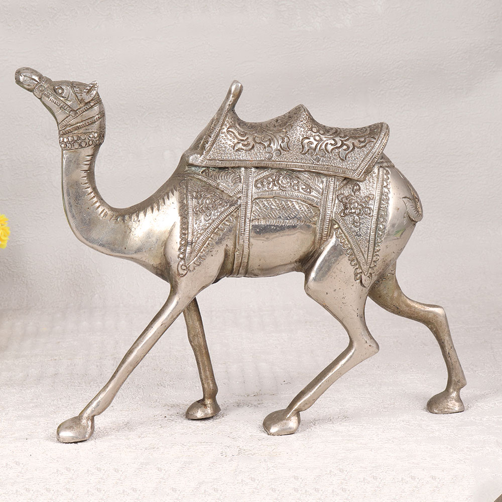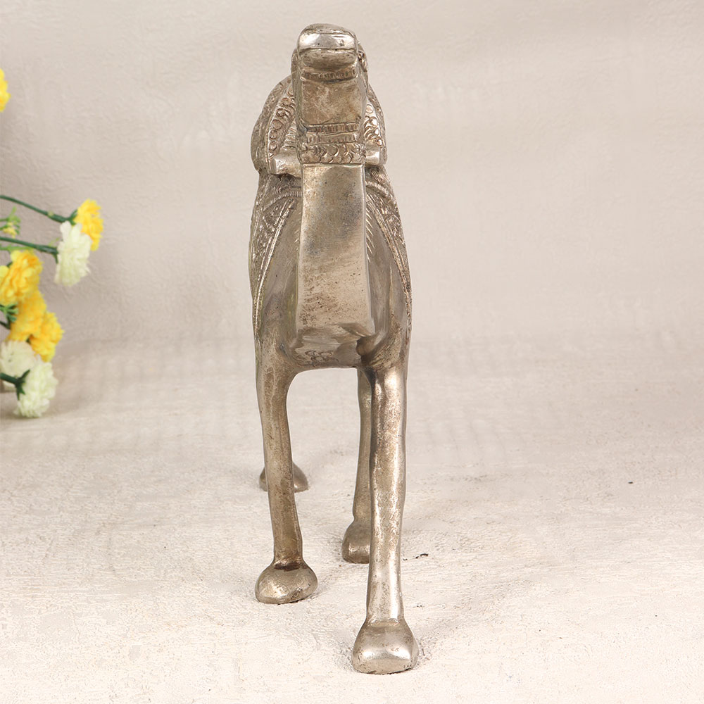 Enhance your space with the exquisite allure of our Brass Standing Camel Statue that is a testament to the artistry of highly skilled and experienced Indian artisans from the vibrant region of Rajasthan. Meticulously handcrafted from high-quality brass, this stunning piece boasts a lustrous silver finish that adds a touch of opulence to any environment. Standing tall with grace and elegance, the camel captures the essence of traditional craftsmanship and cultural richness. Versatile in its appeal, this masterpiece is a versatile addition to your home, office, restaurant, hotel, or cafe, imparting a regal charm to its surroundings. Beyond its aesthetic appeal, the statue becomes a cherished piece in vintage collections, celebrating the time-honoured artistry of Rajasthan. Imbued with cultural significance, this camel statue serves as an ideal gift for your loved ones on special, festive, or auspicious occasions.