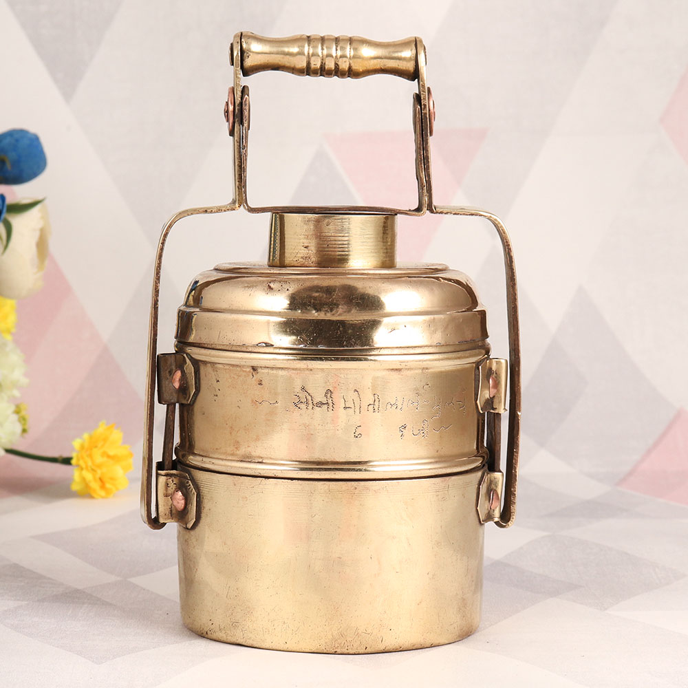 This Brass Tiffin Box with a captivating antique brown finish is a testament to the craftsmanship of highly skilled Indian artisans. Handcrafted from high-quality brass, this unique piece tells a story of tradition and heritage. Originally designed for practicality, this vintage treasure now transcends its functional roots and beckons as a remarkable decorative item. Featuring two compartments, this tiffin box boasts a lock mechanism that echoes the nostalgia of days gone by. Its rich, antique brown finish adds an air of sophistication and elegance to any setting. Whether adorning the dining table at home, adding character to your office space, enhancing the ambiance of a restaurant, hotel, or cafe, this brass tiffin box promises to be a conversation starter. Its versatility knows no bounds. As a thoughtful gift, it holds the power to evoke feelings of nostalgia and appreciation on special, festive, or auspicious occasions.