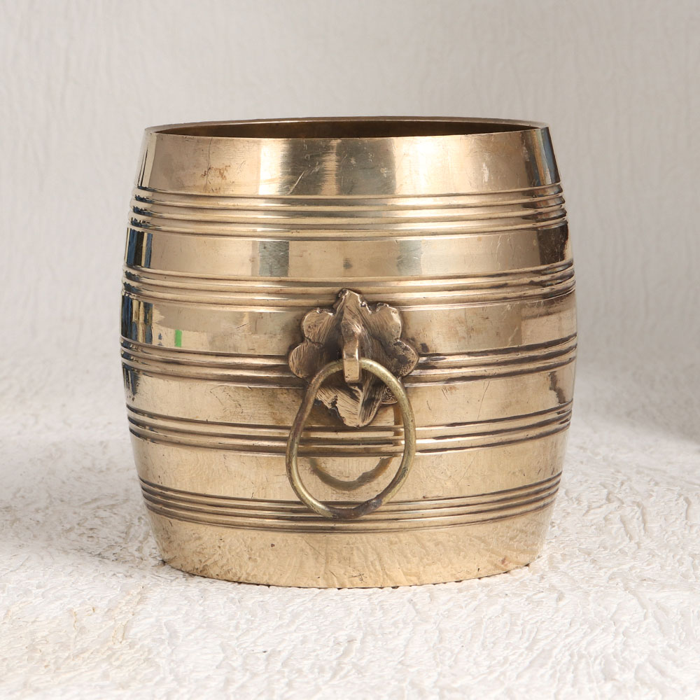Buy a brass measurement pot in a drum shape that is meticulously crafted by highly skilled and experienced Indian artisans using the rich traditions of South Indian Art. This striking piece in a resplendent golden hue finish is a testament to their craftsmanship and attention to detail. The pot features two sturdy handles that not only enhance its visual appeal but also make it easy to transport and display in various settings. Whether gracing your home, office, restaurant, hotel, cafe, or shop, this ornate brass pot exudes an air of sophistication and opulence. Handcrafted from high-quality brass, this pot exudes durability and charm. Its intricate engravings and shiny finish create a captivating play of light, adding an aura of timelessness to any space. As a collector's item, it makes a striking addition to vintage collections, while also serving as a unique and thoughtful gift for loved ones during special, festive, or auspicious occasions.