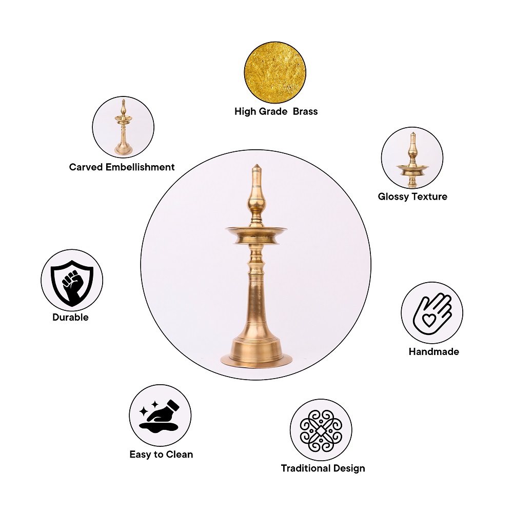 Handmade by skilled artisans in India, this brass oil lamp is a true masterpiece. With its lustrous golden finish and intricate details, it exudes elegance and charm. Buy this brass oil lamp online and get it delivered right at your doorstep. Its sturdy construction ensures durability, making it a cherished item for generations. Perfect for gifting on special and festive occasions, this oil lamp is not only a beautiful decorative piece, but also serves as an essential item for pooja and auspicious rituals. Fill it with mustard oil or ghee, light the cotton wick, and let the warm glow create a serene ambiance in your home.