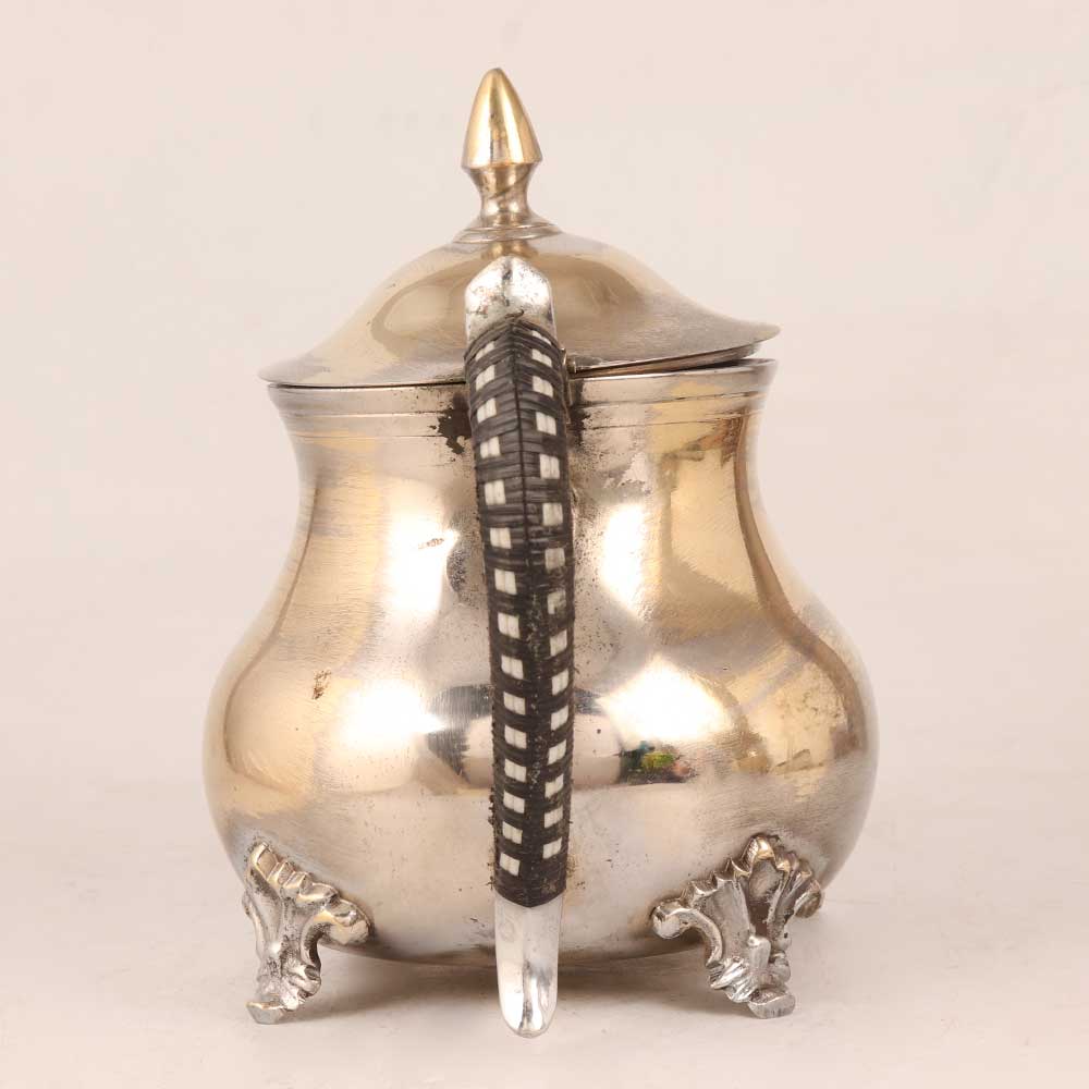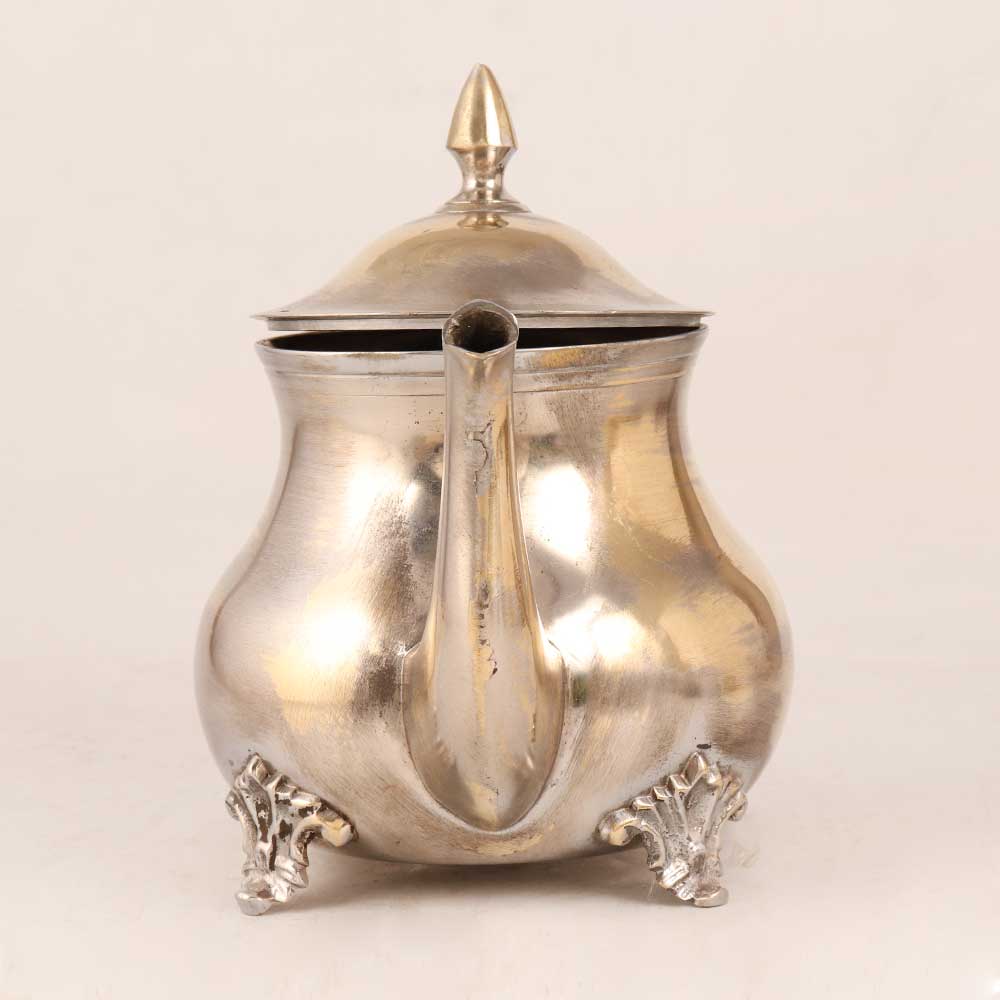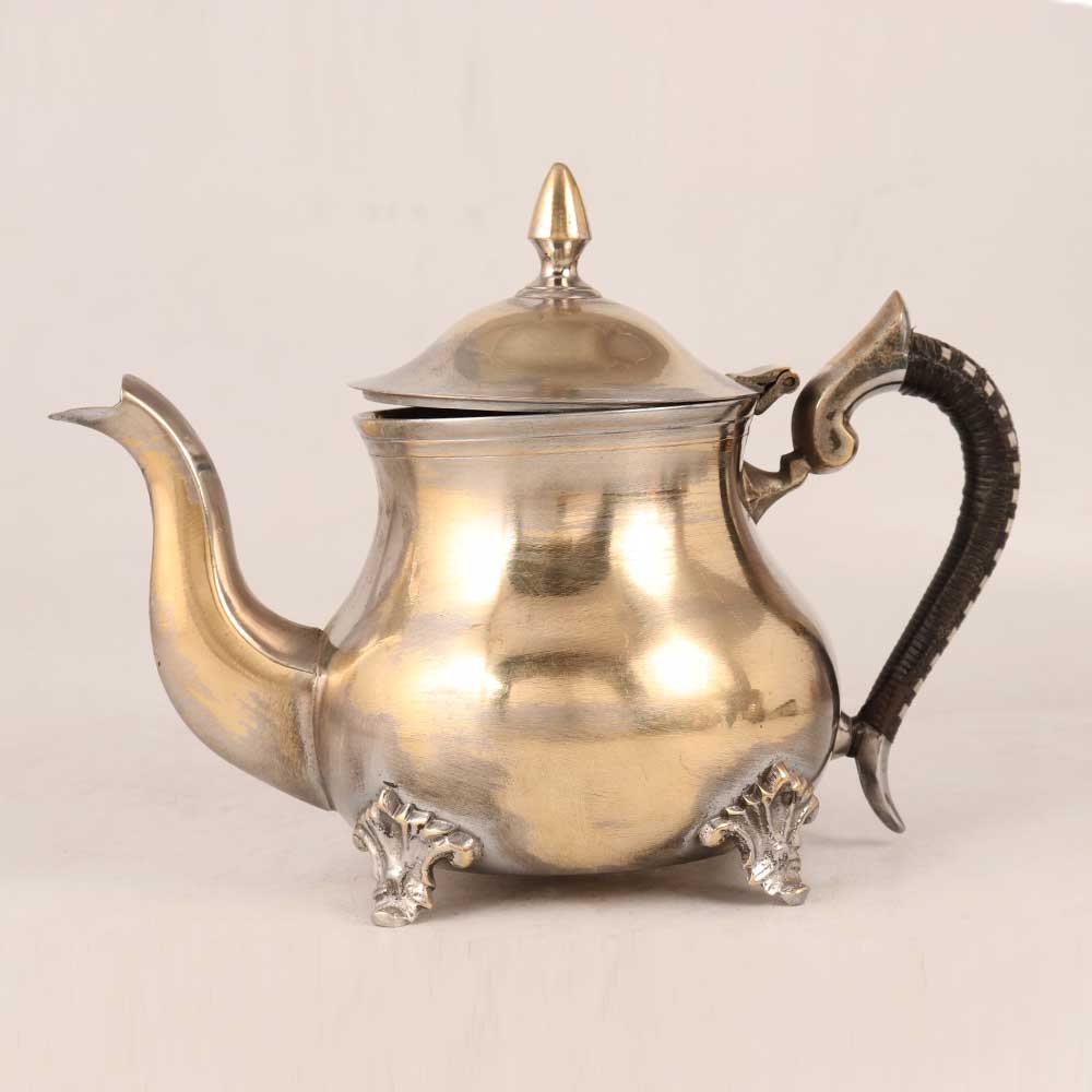 This Vintage Brass Kettle is a delightful fusion of functionality and aesthetic appeal that exudes timeless elegance. This extraordinary piece features a tastefully designed lid and a gracefully curved spout, perfectly complemented by four designer legs that add a touch of sophistication and stability when placed on any surface. Handcrafted with utmost care and precision, this kettle is crafted from high-quality brass, ensuring durability and longevity. Its glossy golden and silver finish adds a luxurious sheen to any setting, making it a captivating centerpiece wherever it resides. Originally used for steeping tea, this kettle has gracefully aged with time, making it unsuitable for cooking purposes. However, it remains a delightful collectible for tea enthusiasts and admirers of English Art. Ideal for display in homes, offices, restaurants, hotels, or cafes, it instantly adds a touch of vintage charm to any space. Whether showcased at exhibitions or included in a cherished vintage collection, this kettle holds nostalgic value and makes for a thoughtful and cherished gift for loved ones on special, festive, or auspicious occasions.