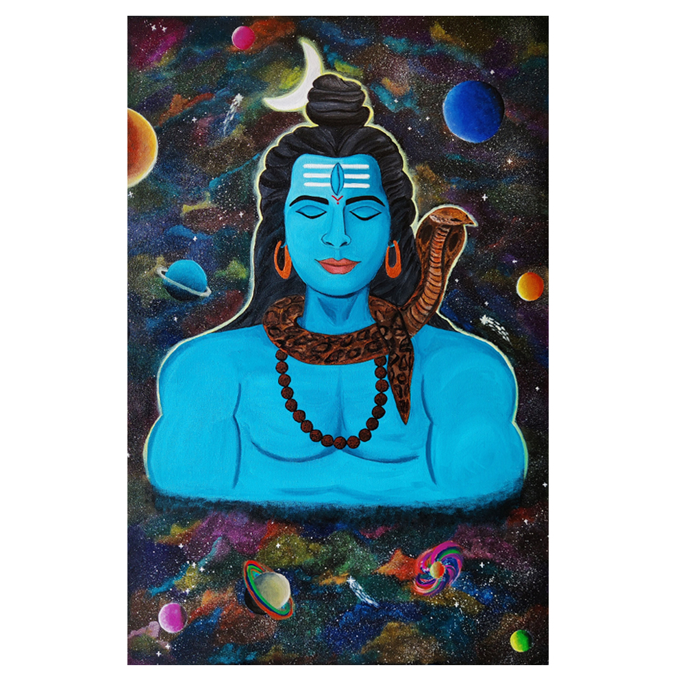 A captivating acrylic painting of Lord Shiva meditating amidst a cosmic galaxy, symbolizing his boundless power and stillness as the eternal ruler of the universe. With planets, stars, and nebulae swirling around him, this artwork by Artist Dimpana blends mythology with a galactic vision, offering spiritual depth and vibrant detail on a sturdy canvas board.