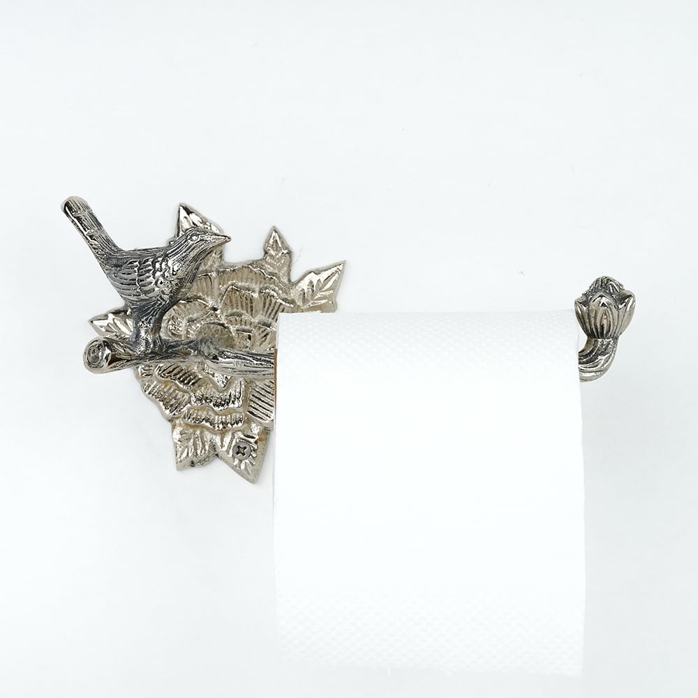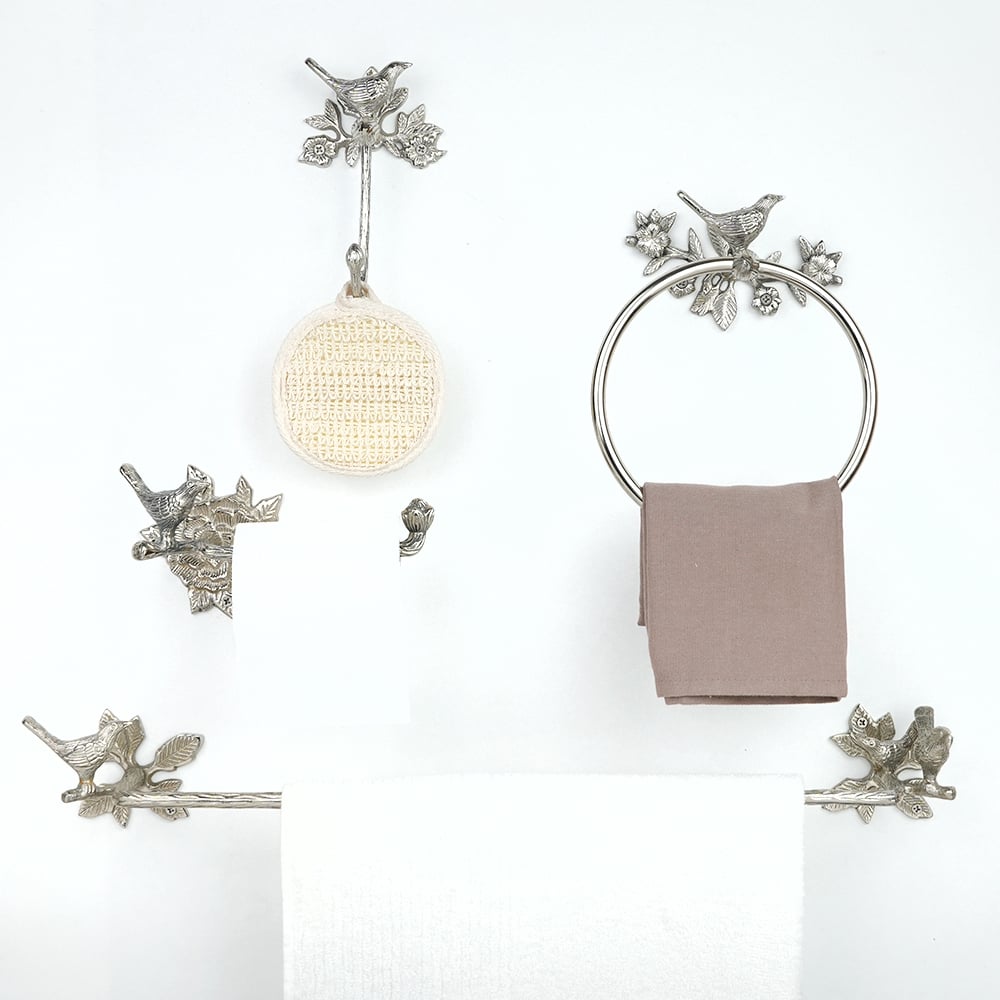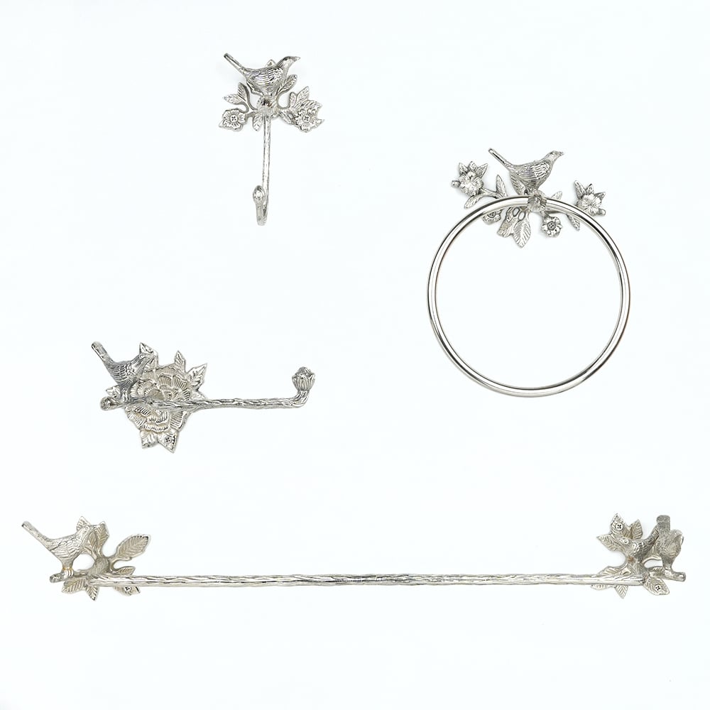 This set of four carefully designed bathroom accessories combines style and utility. With its delicate bird motif, this collection adds an artistic flair to everyday bathroom essentials, turning each item into a decorative statement. The smooth silver brass finish not only complements a wide range of bathroom decor styles but also ensures durability and long-lasting appeal.