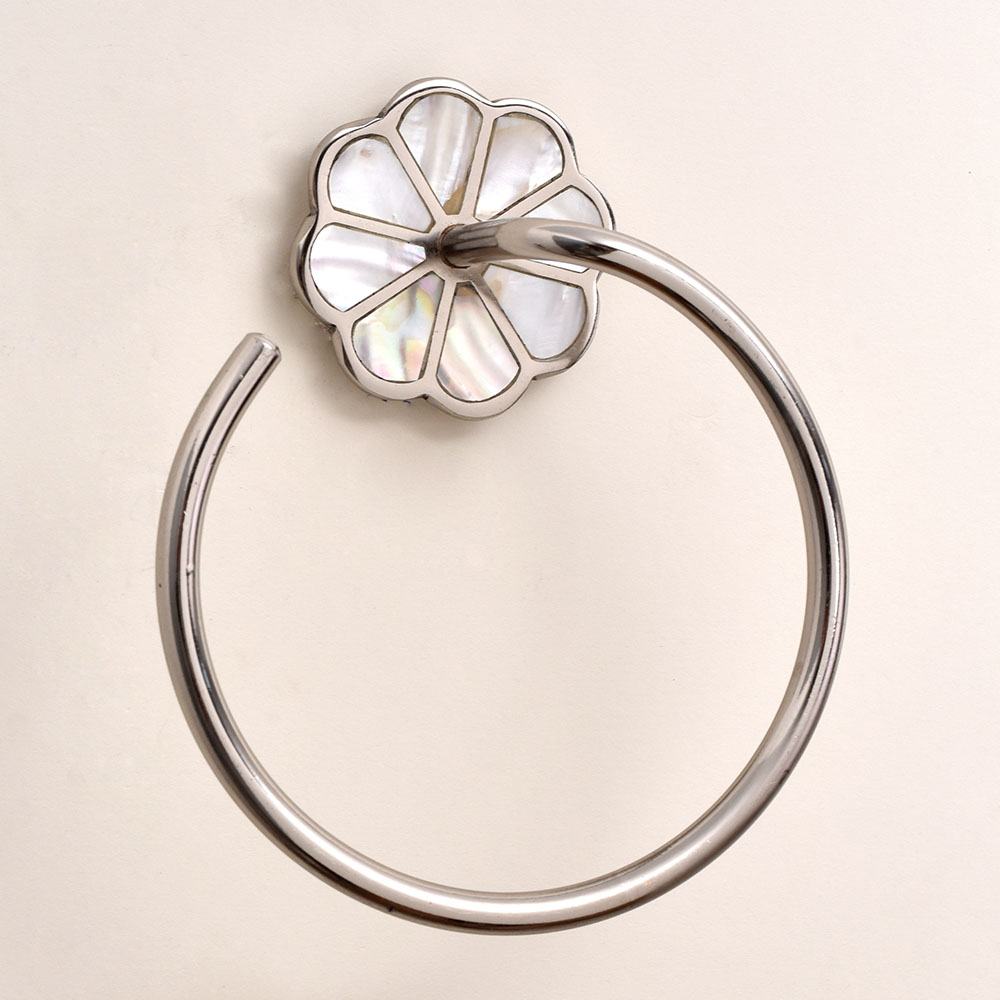 The exquisite mother-of-pearl inlay provides a sophisticated, textured appearance, while the silver brass frame guarantees durability and strength. This towel ring serves as both a stunning decorative element and a practical accessory to keep your towels conveniently accessible.