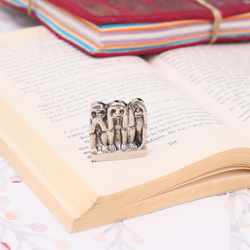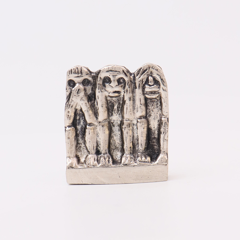 A beautiful vintage recreation of the traditional brass three wise Monkeys is displayed. The three mystic apes, as they are sometimes known, represent a visual maxim. They represent the adage "see no evil, hear no evil, speak no evil" as a unit. Because they double as decorative accent pieces and incense burners, these three brass pieces are distinctive. It comes in silver finish.
