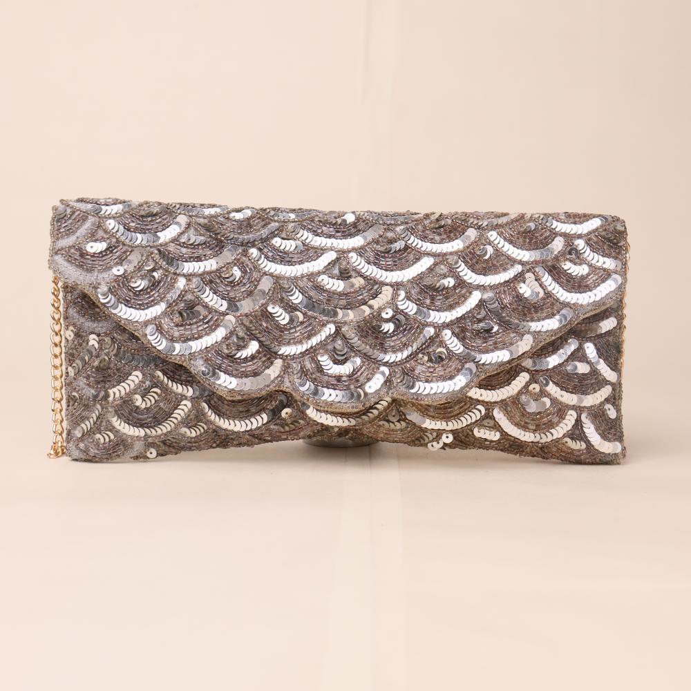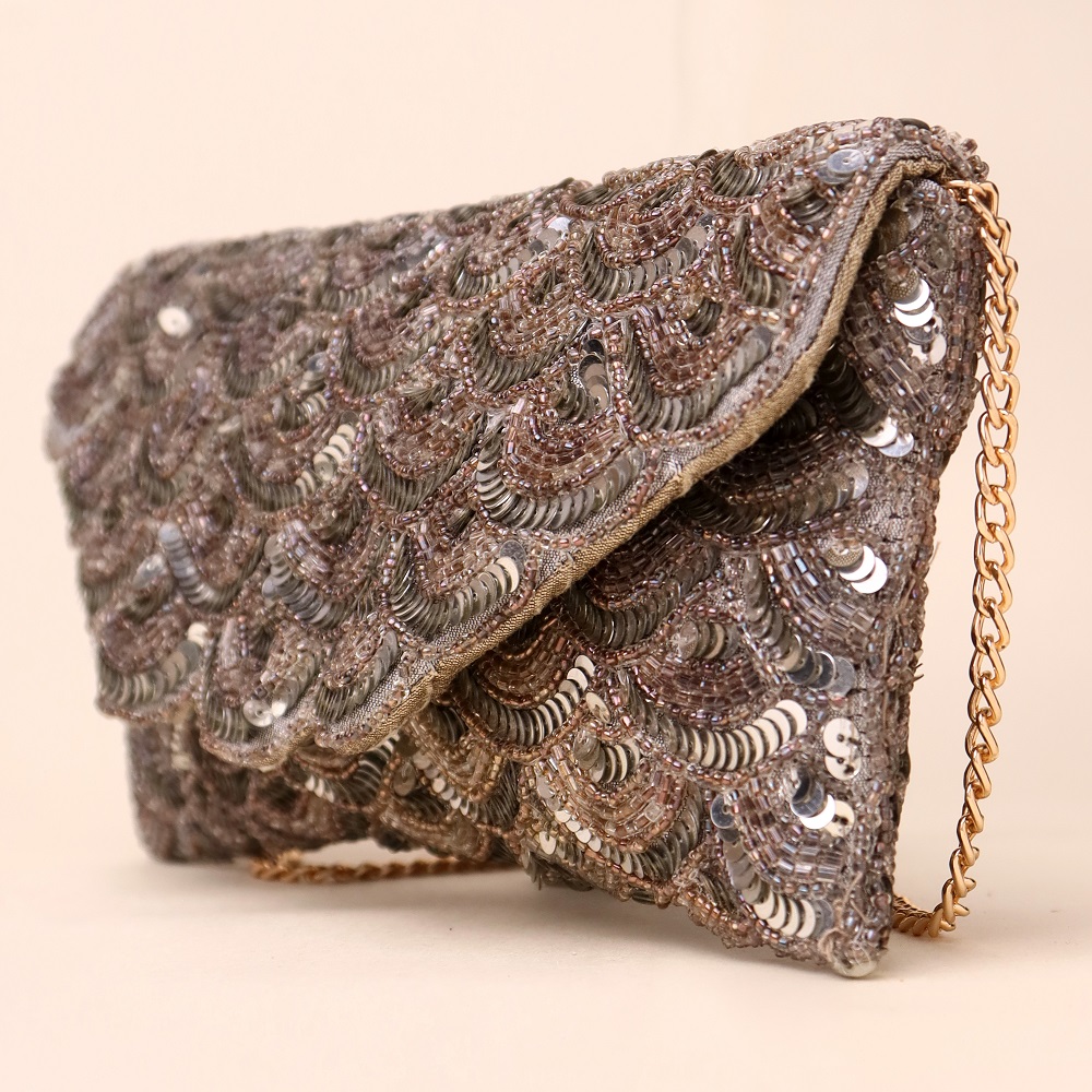 Add a touch of timeless glamour with this exquisite hand-embroidered sling bag featuring cascading sequin patterns in shimmering silver tones. The elegant scalloped design catches the light beautifully, making it the perfect accessory for evening events, weddings, and festive celebrations. Complete with a gold-tone chain strap, this versatile piece can be worn as a crossbody, shoulder bag, or carried as a clutch for a sophisticated finish.