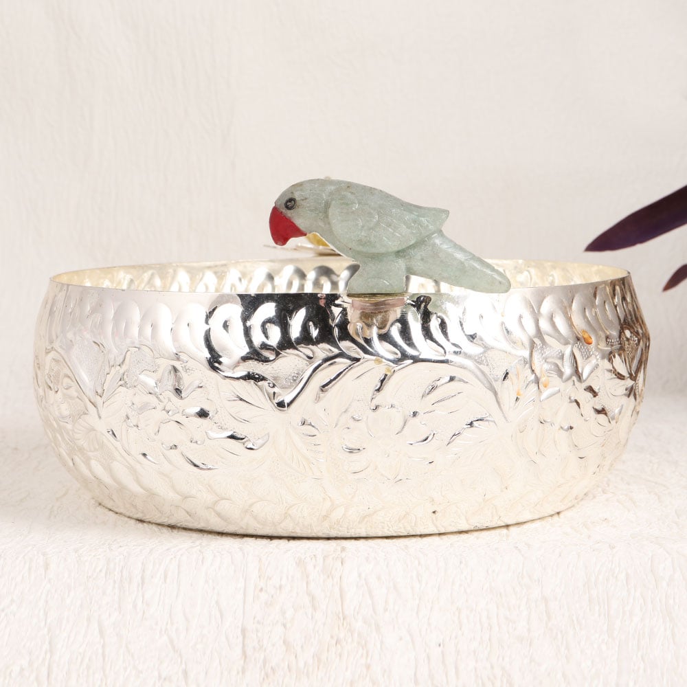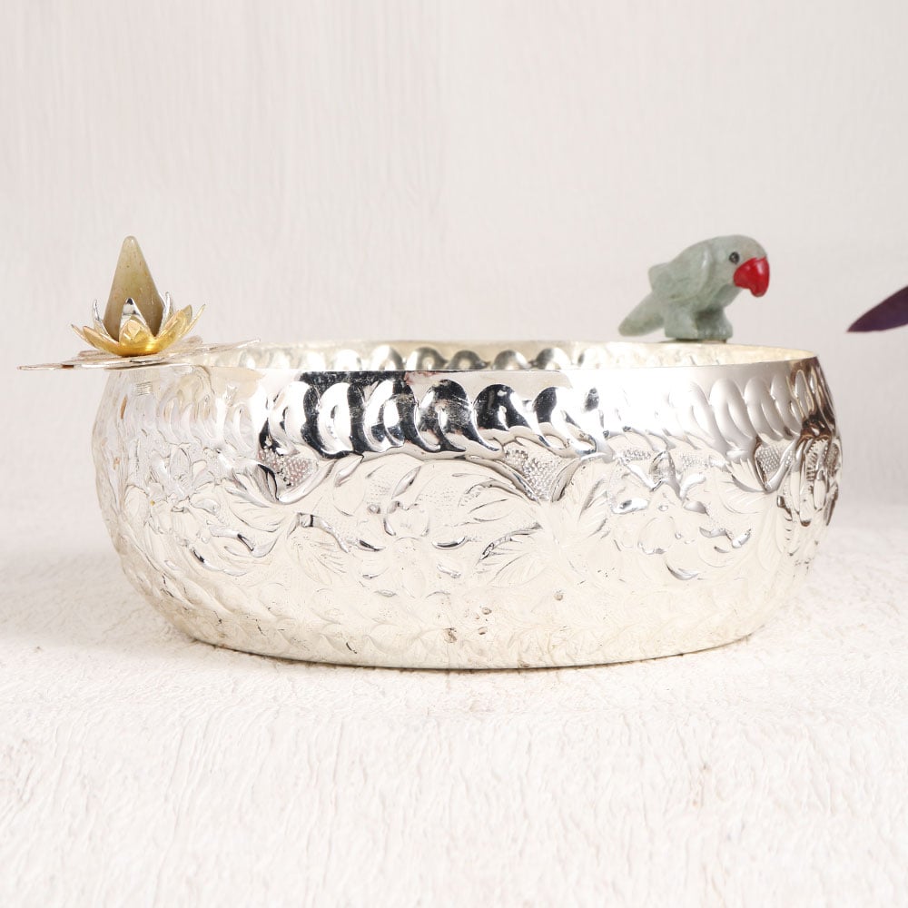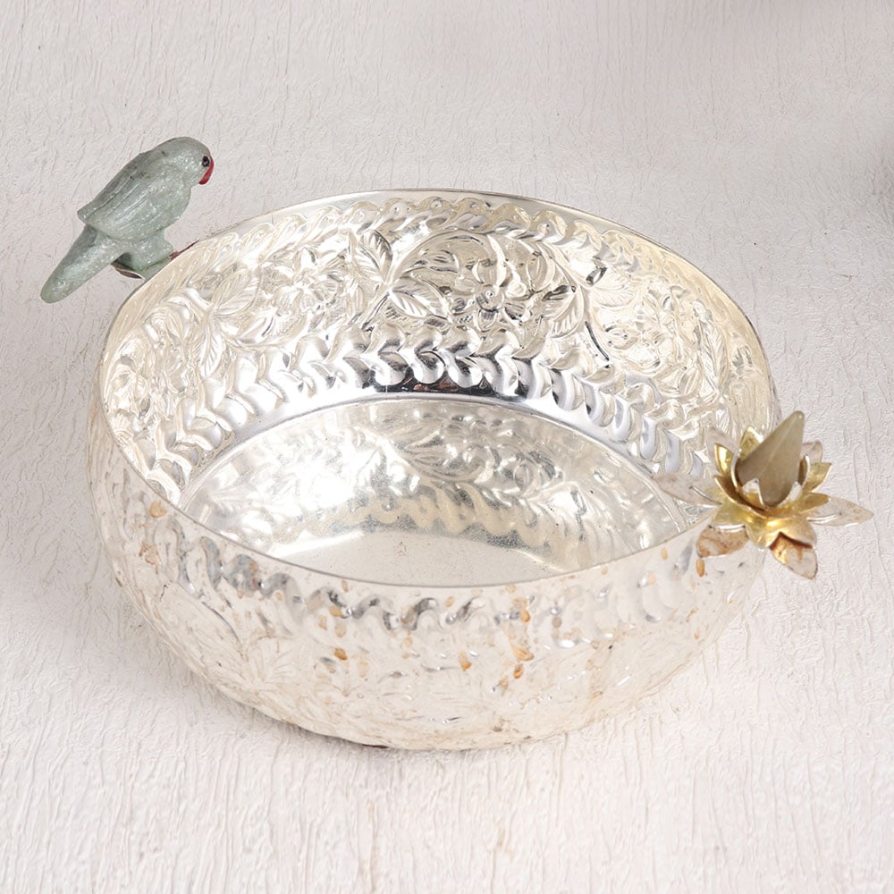 Decorate your interior with the exquisite craftsmanship of this European Art-inspired white metal bowl. This round masterpiece boasts a radiant silver finish, crafted meticulously by highly skilled artisans. Its stunning design is a harmonious blend of tradition and elegance, featuring an ornate lotus and a charming parrot carved delicately along its edge, bringing a touch of nature's grace to any space. This versatile bowl is an artful addition to your home, office, hotel, cafe, shop, or restaurant, making it an ideal choice for both personal and commercial settings. Placed as a centerpiece or on a mantel, it adds an aura of sophistication and serenity. As a thoughtful gift, it's perfect for commemorating special moments, festive celebrations, or auspicious occasions, symbolizing the beauty of intricate craftsmanship and timeless design.