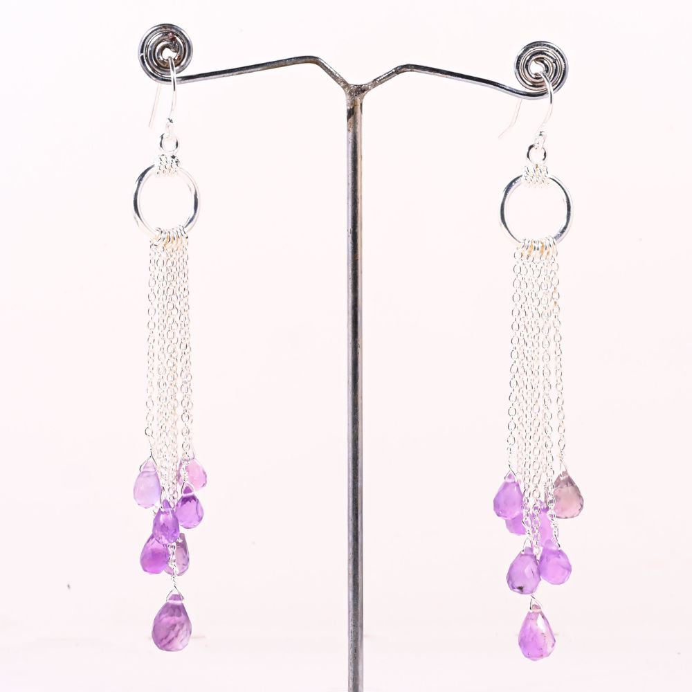 The Silver Plated Brass Drop Dangle Earrings with Amethyst Gemstone are designed to express elegance through length, colour, and natural stone beauty. Crafted in brass and finished with a smooth silver plating, these earrings highlight the rich purple tones of amethyst, known for its depth and calming presence. The elongated drop silhouette creates fluid movement, making the earrings striking yet graceful. Ideal for women who prefer statement jewellery with meaning and balance.