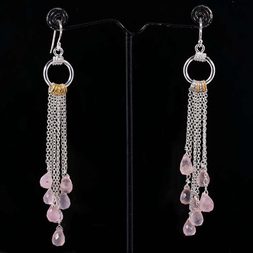 The Silver Plated Brass Drop Dangle Earrings with Natural Rose Quartz Gemstone are designed to express softness, balance, and refined beauty. Crafted in brass and finished with a smooth silver plating, these earrings feature natural rose quartz stones admired for their blush tone and calming presence. The elongated drop silhouette adds fluid movement, creating a graceful statement that feels thoughtful and feminine. Ideal as gift jewellery, they blend emotional meaning with timeless style.