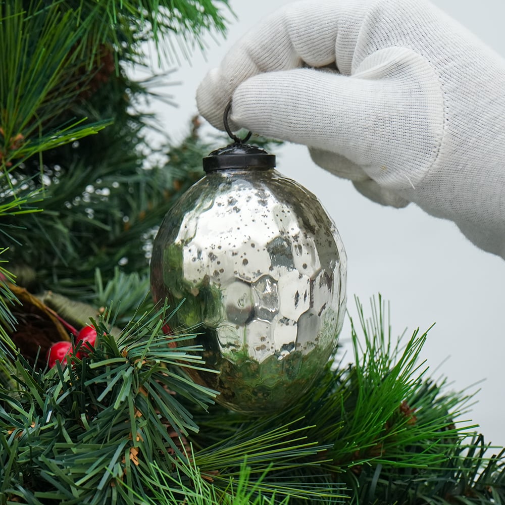 Silver Vintage Avocado Shaped Glass Christmas Ornament. Crafted from high-quality glass with a smooth glossy finish, this decorative bauble adds a classic and festive touch to Christmas trees, wreaths, and holiday displays.