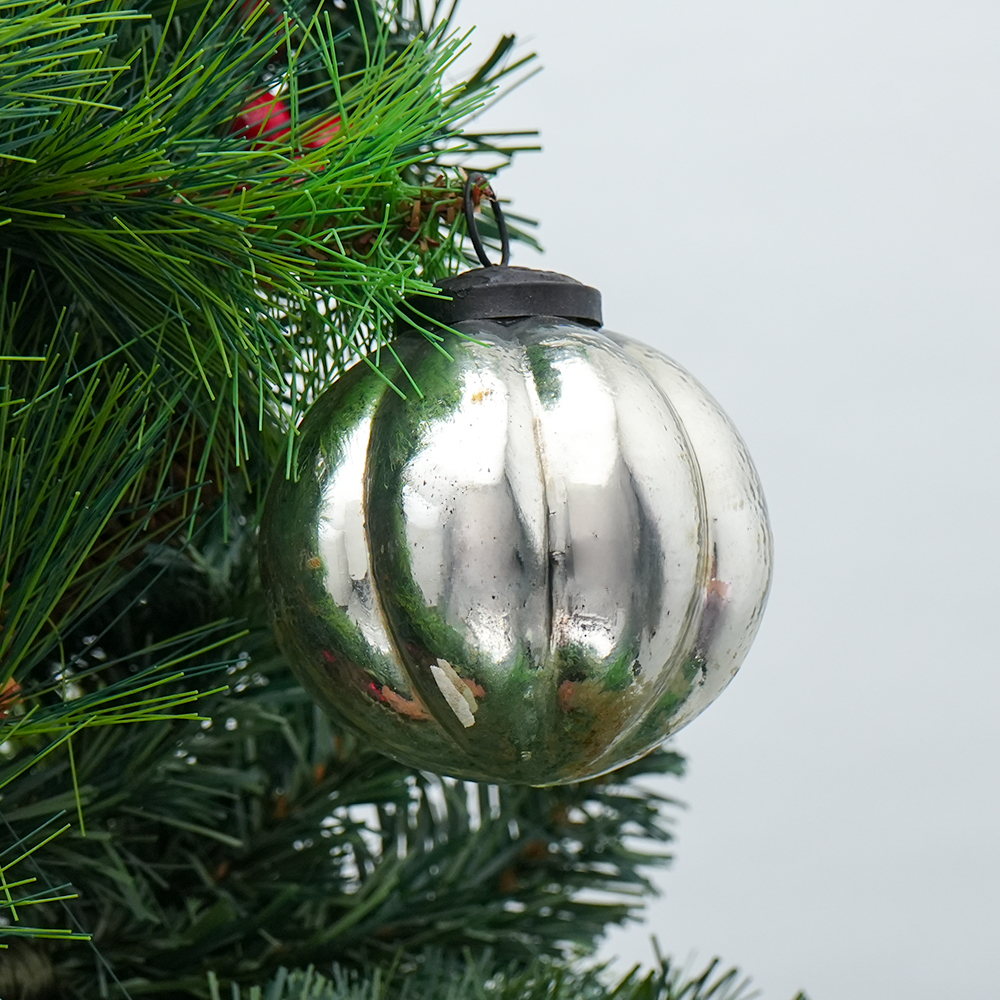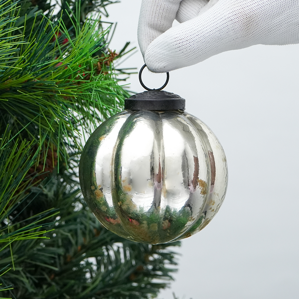 Indianshelf.com for bulk/wholesale orders.Indianshelf.us for personal purchases.The Silver Melon Glass Christmas Hanging Ornaments bring a sophisticated and stylish sparkle to your holiday décor. With their gleaming silver color and melon-inspired shape, these ornaments create a graceful, timeless effect on your tree or festive display. Perfect for adding an elegant touch, they capture the light and reflect it beautifully, enhancing the overall festive atmosphere.