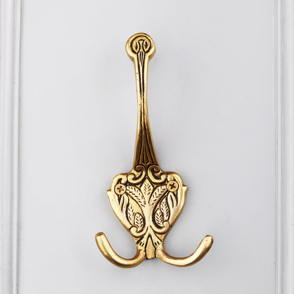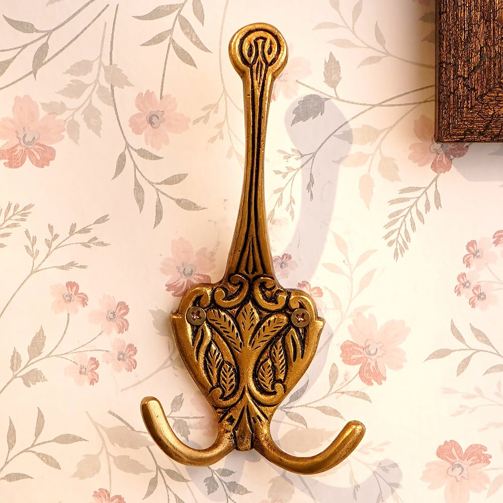 The elegant floral engraving on the brass surface adds a touch of sophistication to the simple yet functional design. This tri-hook not only provides ample space for hanging coats, bags, scarves, or accessories, but it also enhances your décor with its intricate craftsmanship. The warm brass finish gives it a luxurious feel, making it a standout feature in any room.
