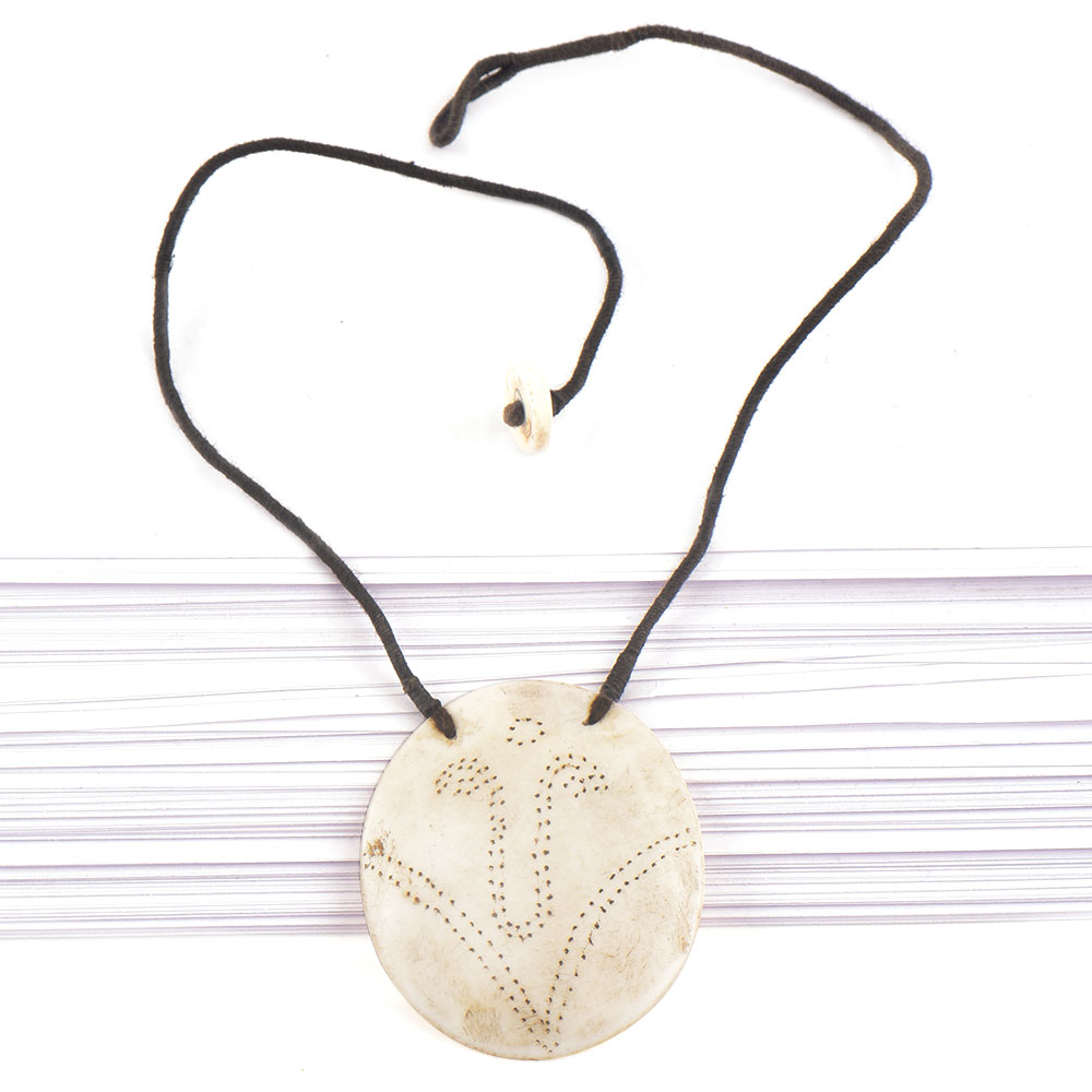 This single Engraved tribal design on seashell pendant is made by the local artisans of India .The jewelry is made of a number of shell or two to three whole shells that are drilled with adjustable black thread which makes it easy to wear and fit.