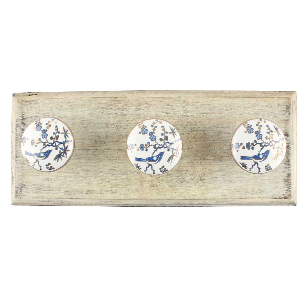 Slate Blue Bird Ceramic Floral Wooden Hook. A Perfect Complement to the Soft Tone of the Wood are these White Traditional Hat and Coat Hook Made of Genuine Porcelain and Brass. It can be used to Hang Jewelry, Leashes, Towels, Scarves, Light Weight Sweaters, Caps etc.