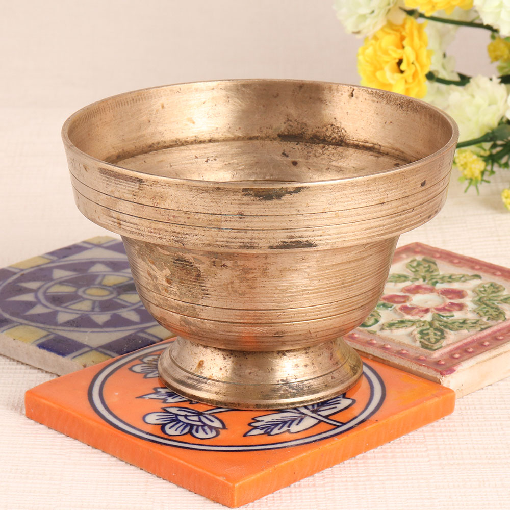 A handmade bowl to decorate your prayer room at home, office, hotel or restaurant. This high quality brass bowl has an engraving of circular rings that sets it apart from other bowls. A small bowl that plays an important role during pooja. Use it to store kumkum tilak and apply it on the forehead of the devotee between the eyebrows, which helps concentration. Buy this handmade bowl online, made by skilled and experienced Indian artisans in South Indian art. An exceptional piece that should not be missing from your vintage art collection. An ideal gift for wedding, anniversary, birthday, corporate party, farewell, housewarming, thanksgiving, festival or auspicious function for your family, friends and relatives.