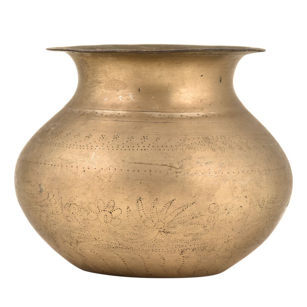 Engraved Brass Water Pot (Lota) From North India is Handmade by the Local Artisans and Each Pot has a Distinct Design No Two Pots are Identical. The Pot Carries the Distinct Design of the Time. This Exquisite Piece is a Treat for Collectors and Makes for a Wonderful Decor Accent.