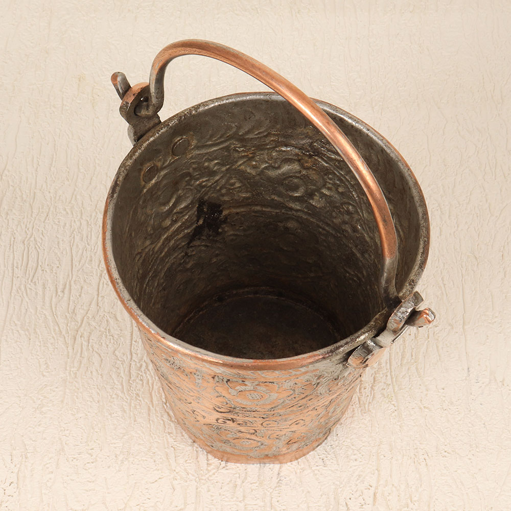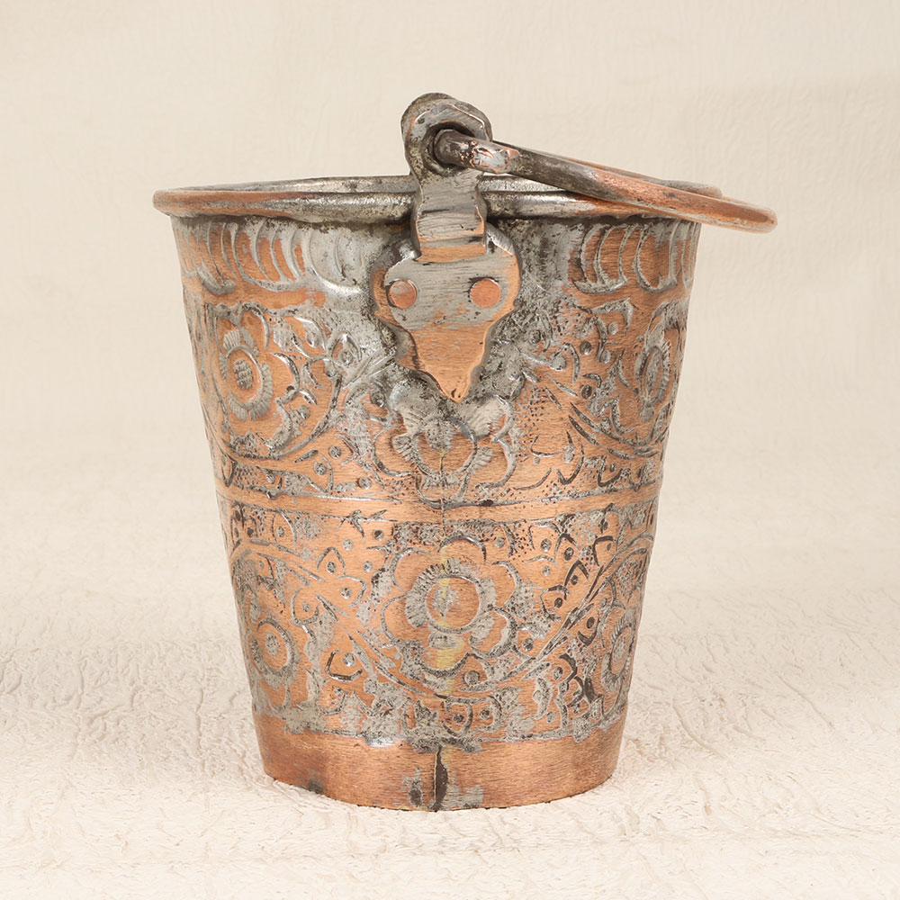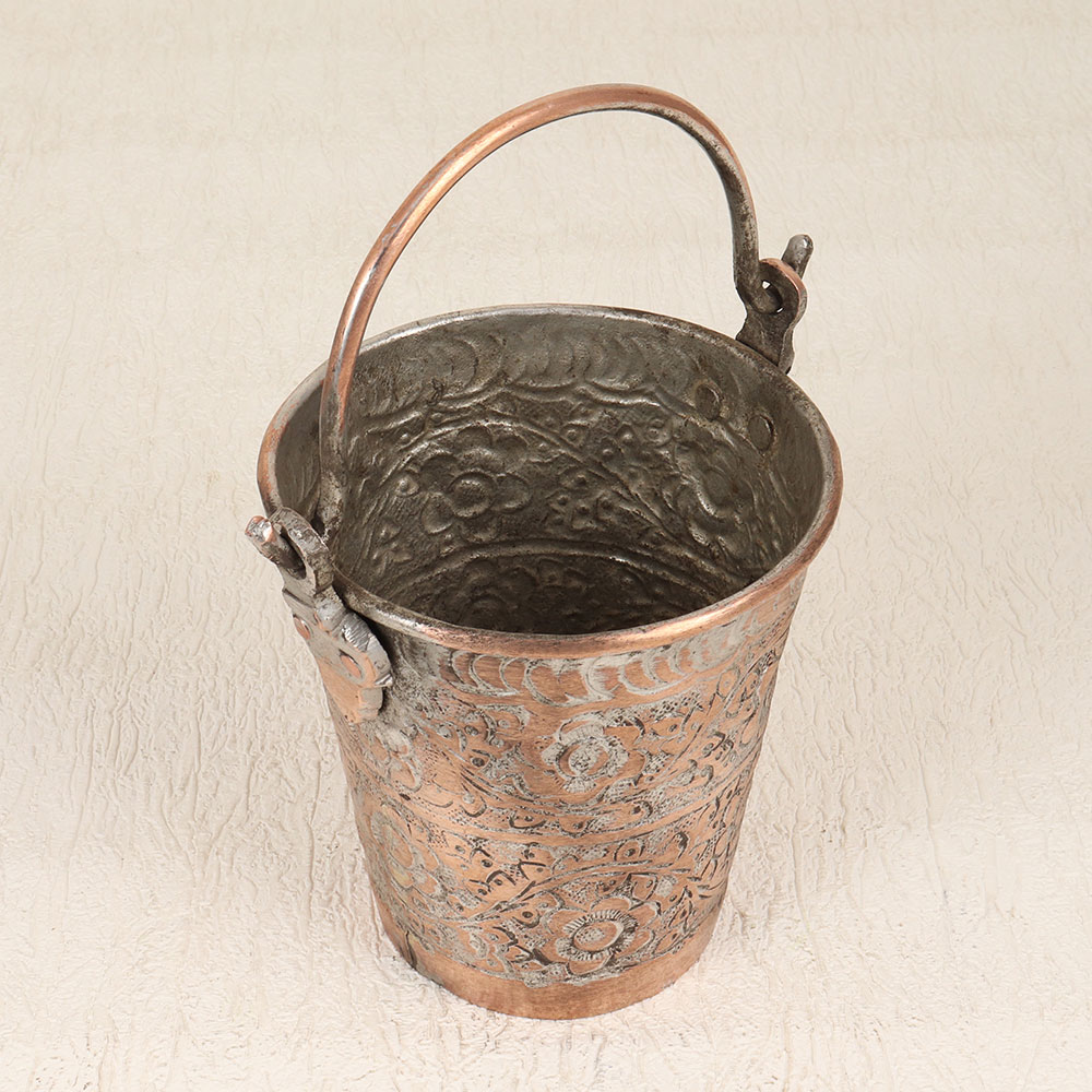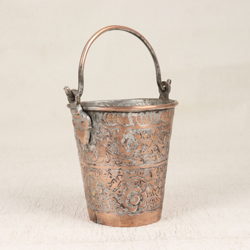 Add a touch of vintage charm to your home decor with this stunning copper bucket. Crafted from pure copper in a rich, earthy brown finish, this bucket makes a statement wherever it's displayed. The intricate engraving in an Islamic floral motif gives it an exotic, worldly vibe. This bucket is perfect for creating an elegant focal point on a coffee table, console, or shelf. The vintage styling and handcrafted artisanal details make it ideal for farmhouse, boho, or eclectic home decor. Use it to store blankets, magazines, or firewood for an elegant way to corral everyday clutter. The engraved copper gleams beautifully in any lighting. For anyone seeking a unique accent piece that adds a touch of exotic flair, this engraved copper bucket is sure to elevate your space. The vintage styling gives it a timeworn, heirloom-quality look that feels special. Let this bucket become your new favorite decorative object!