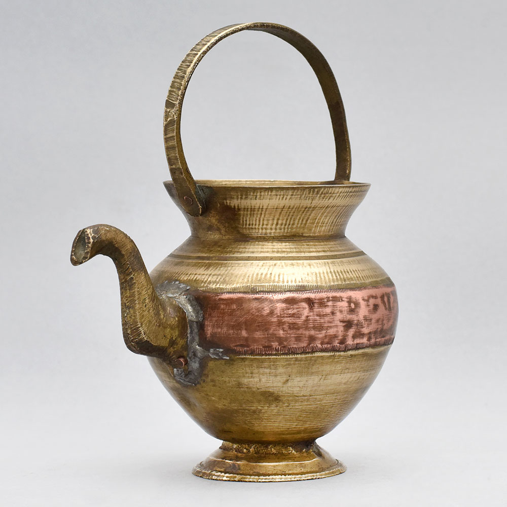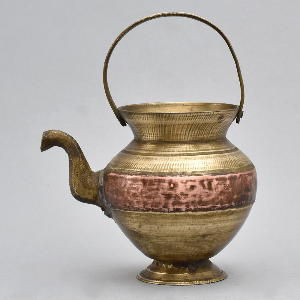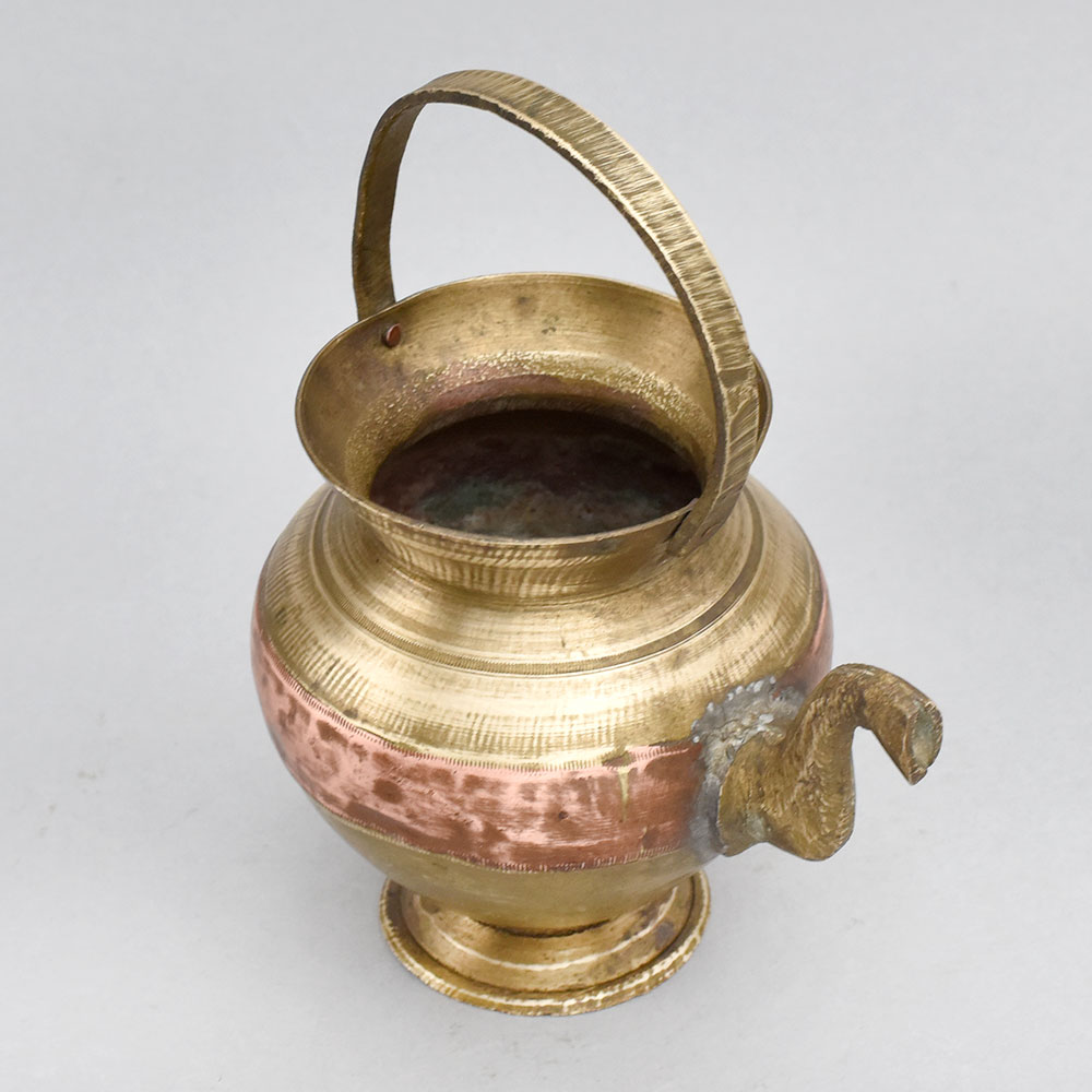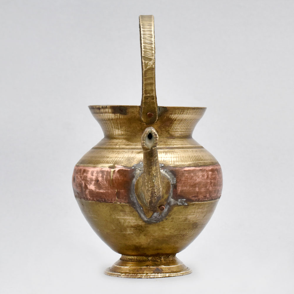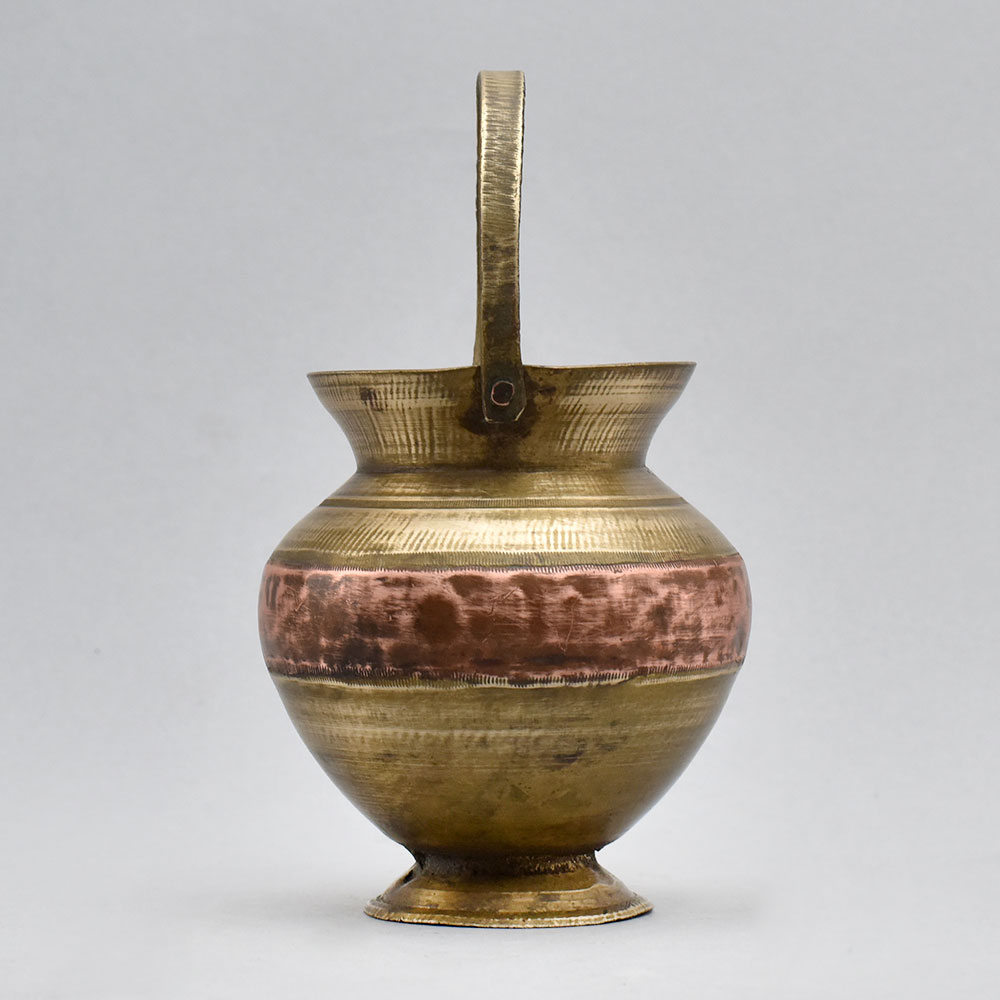 Infuse your home with the allure of ancient India using this small, antique brass pot with a gleaming copper inlay. Vintage, brass construction with intricate copper detailing Sturdy handle for easy carrying of holy water Broad base provides excellent stability Durable and visually striking This traditional Indian vessel was originally crafted to transport sacred water, but its timeless elegance makes it a captivating decorative accent. Display it proudly as a conversation piece or give it as a thoughtful housewarming gift that celebrates rich cultural heritage. The brass and copper materials ensure exceptional quality and longevity, while the intricate design adds a touch of refined sophistication. Embrace the beauty of Himalayan artistry and elevate your space with this exquisite piece. This unique handcrafted piece is a testament to traditional artistry, blending functionality with beauty and making it a treasured collectible for years to come.