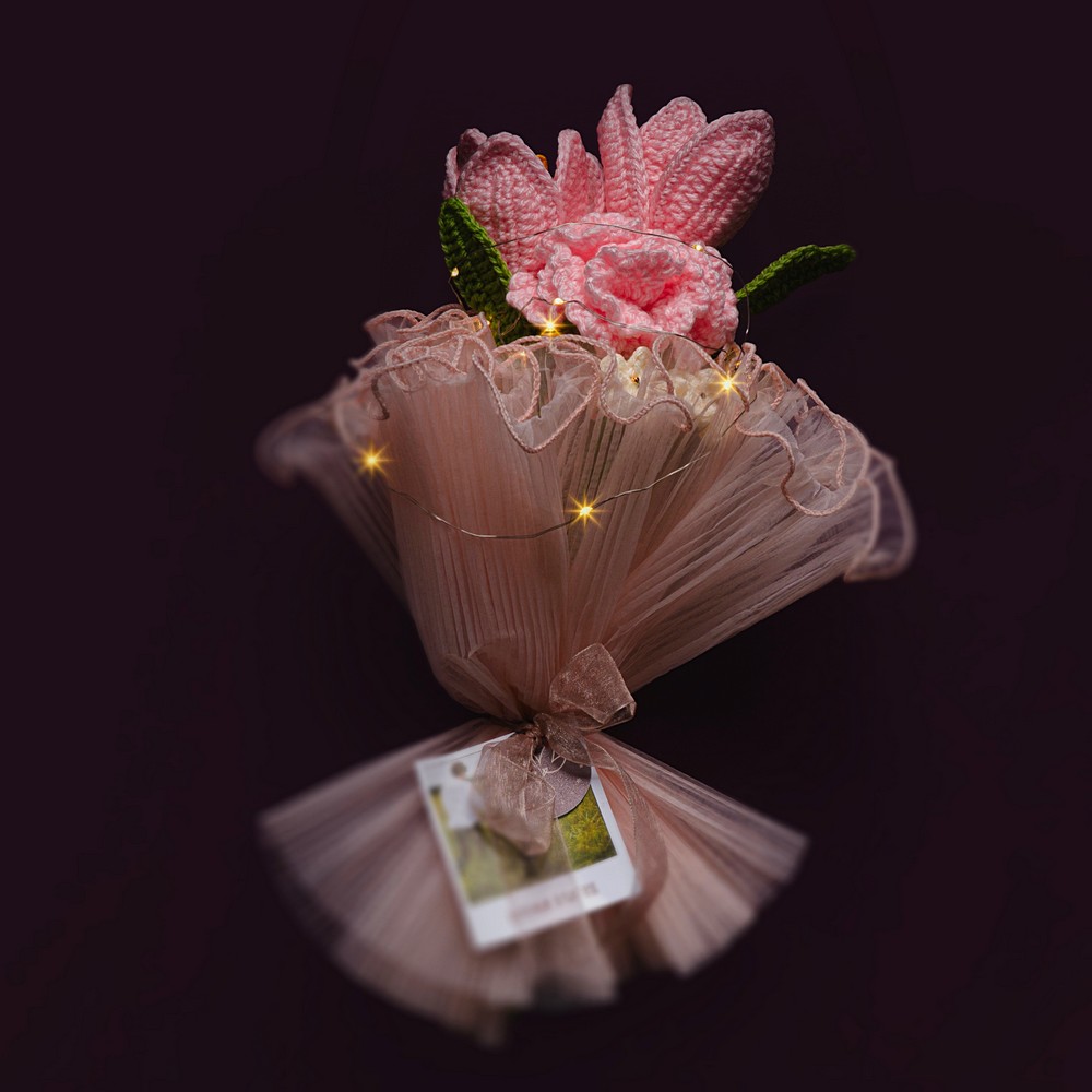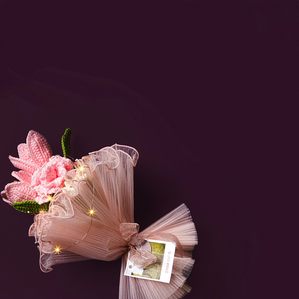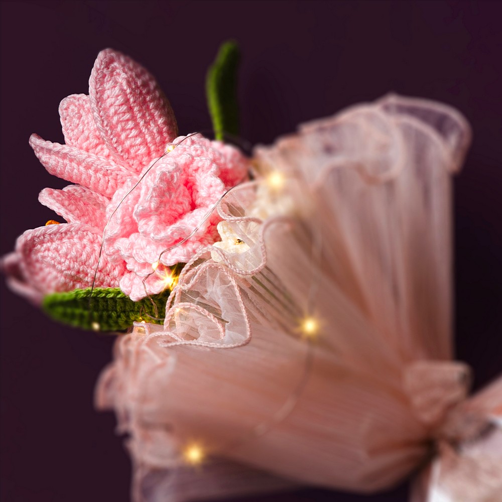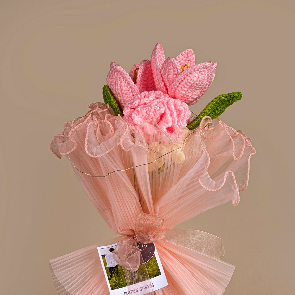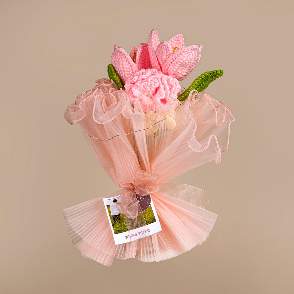 • Soft Pink Crochet Tulip Bouquet With Tulle