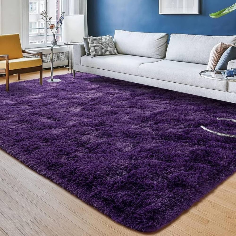 Vacuum lightly to maintain its fluffy texture. Spot clean with mild detergent for spills. Keep away from prolonged sunlight exposure to preserve the vibrant purple shade.