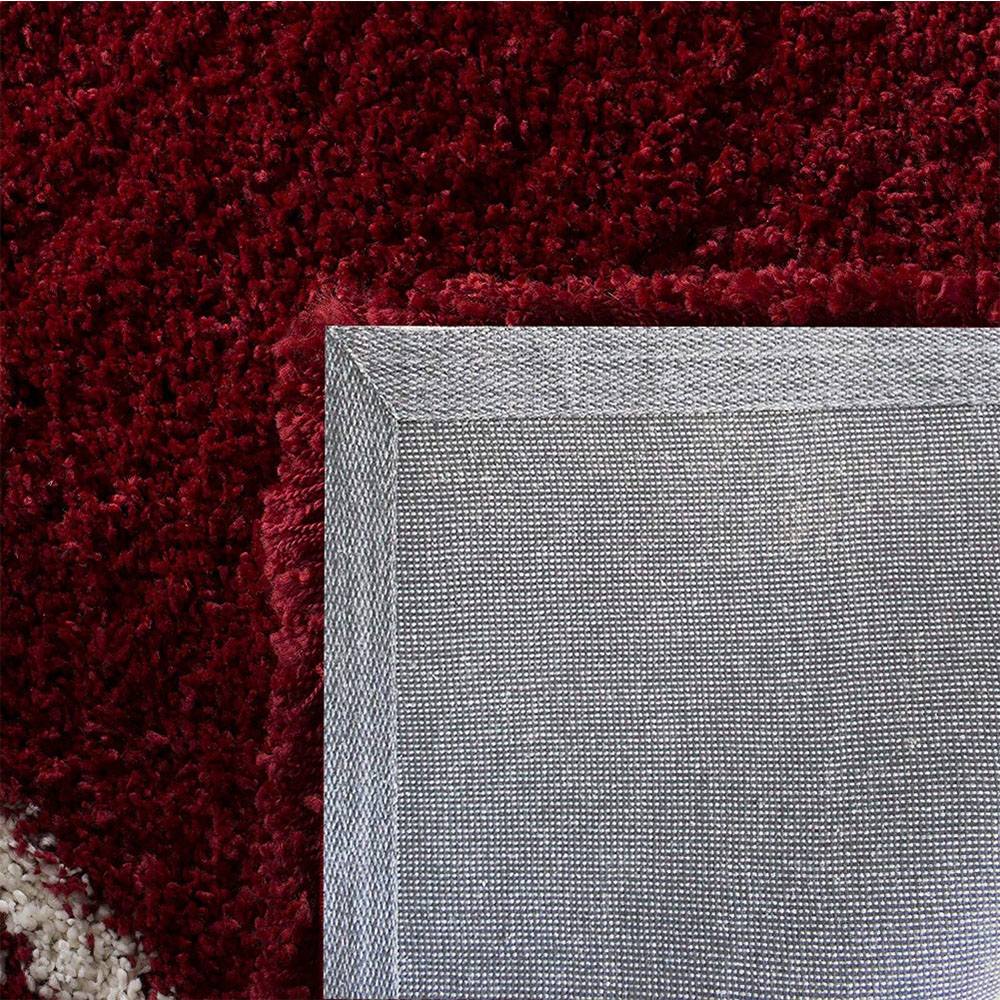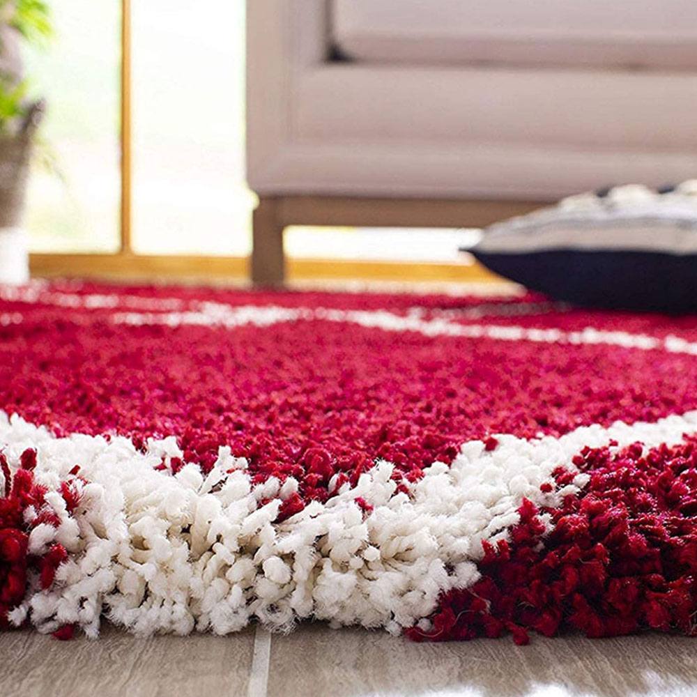 Vacuum regularly using a soft brush attachment to preserve pile texture. Clean spills immediately with mild soap and water. Avoid exposure to direct sunlight to maintain the rich red color and soft ivory contrast.