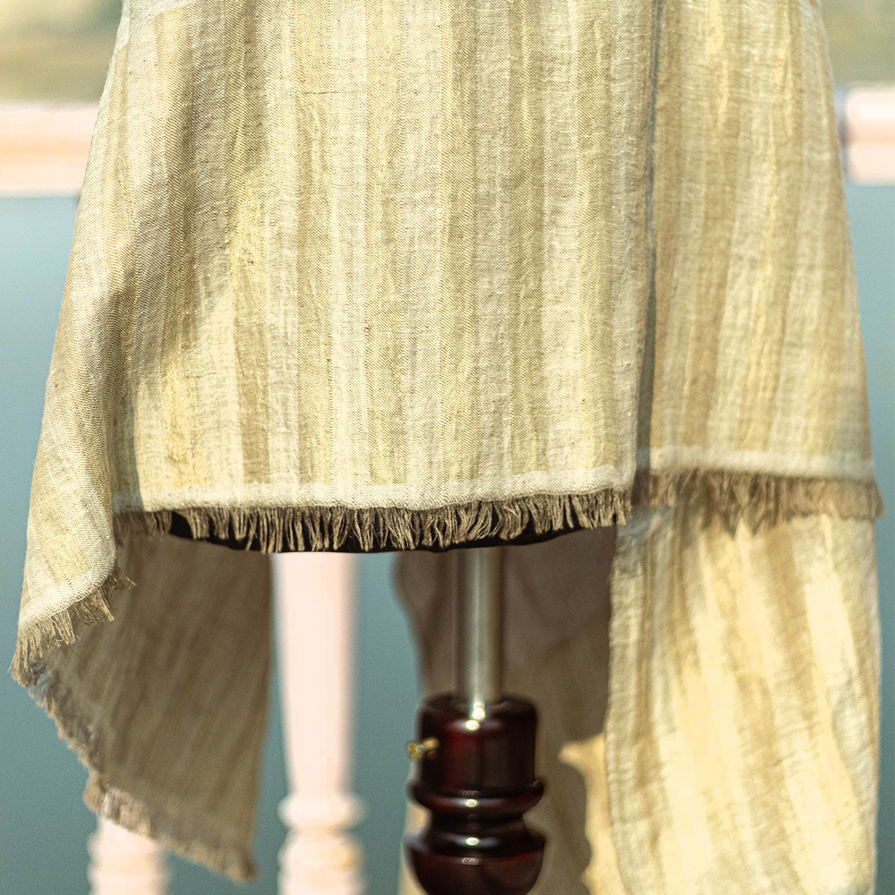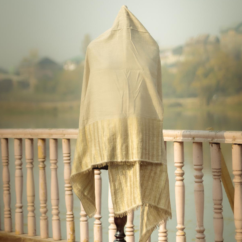 This Kashmiri shawl reflects a preference for minimal, heritage textiles where the value comes from the fibre blend, weave feel, and finishing details. The understated striped border and soft drape make it a timeless piece meant for repeat wear across seasons.