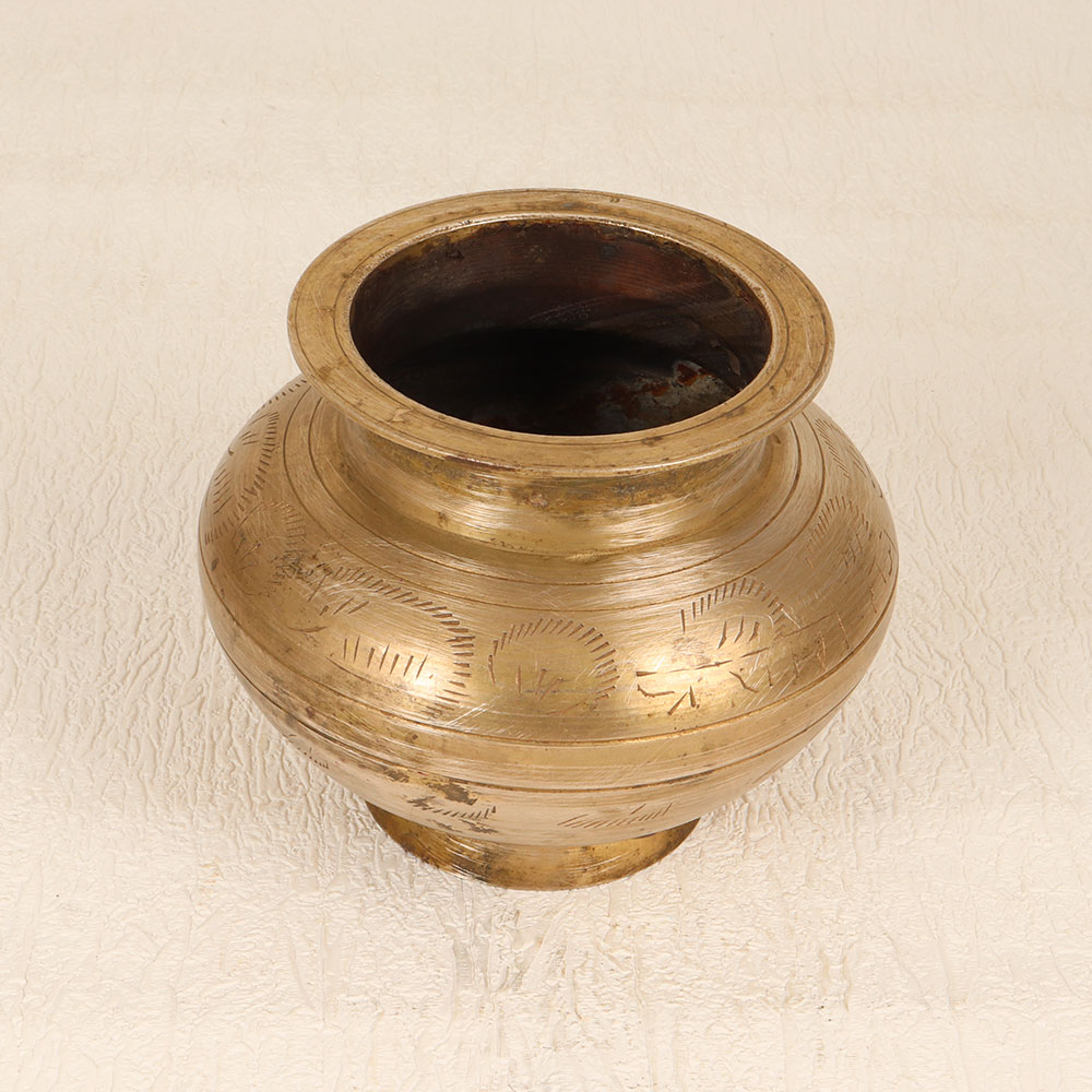 This Vintage Brass Holy Water Pot is a testament to the rich cultural heritage of South Indian Art. Meticulously crafted by talented Indian artisans, this sacred vessel is fashioned from high-quality brass and boasts an antique brown finish, evoking a sense of timeless elegance. Ideal for prayer, rituals, and havans, this holy water pot is adorned with intricate engravings, each telling a story of spiritual significance. Its handmade nature ensures a unique touch, making it a cherished addition to any space. Versatile and functional, it serves as a divine receptacle for holy water during religious ceremonies, while its aesthetic appeal allows it to seamlessly blend into home, office, restaurant, hotel, or cafe prayer rooms. Beyond its religious utility, this pot transforms into a stunning indoor flower pot, adding a touch of vintage charm to your decor. A perfect item for collectors seeking unique pieces with historical allure, it makes for an exceptional gift during special, festive, or auspicious occasions, symbolizing the best of craftsmanship and spiritual devotion.
