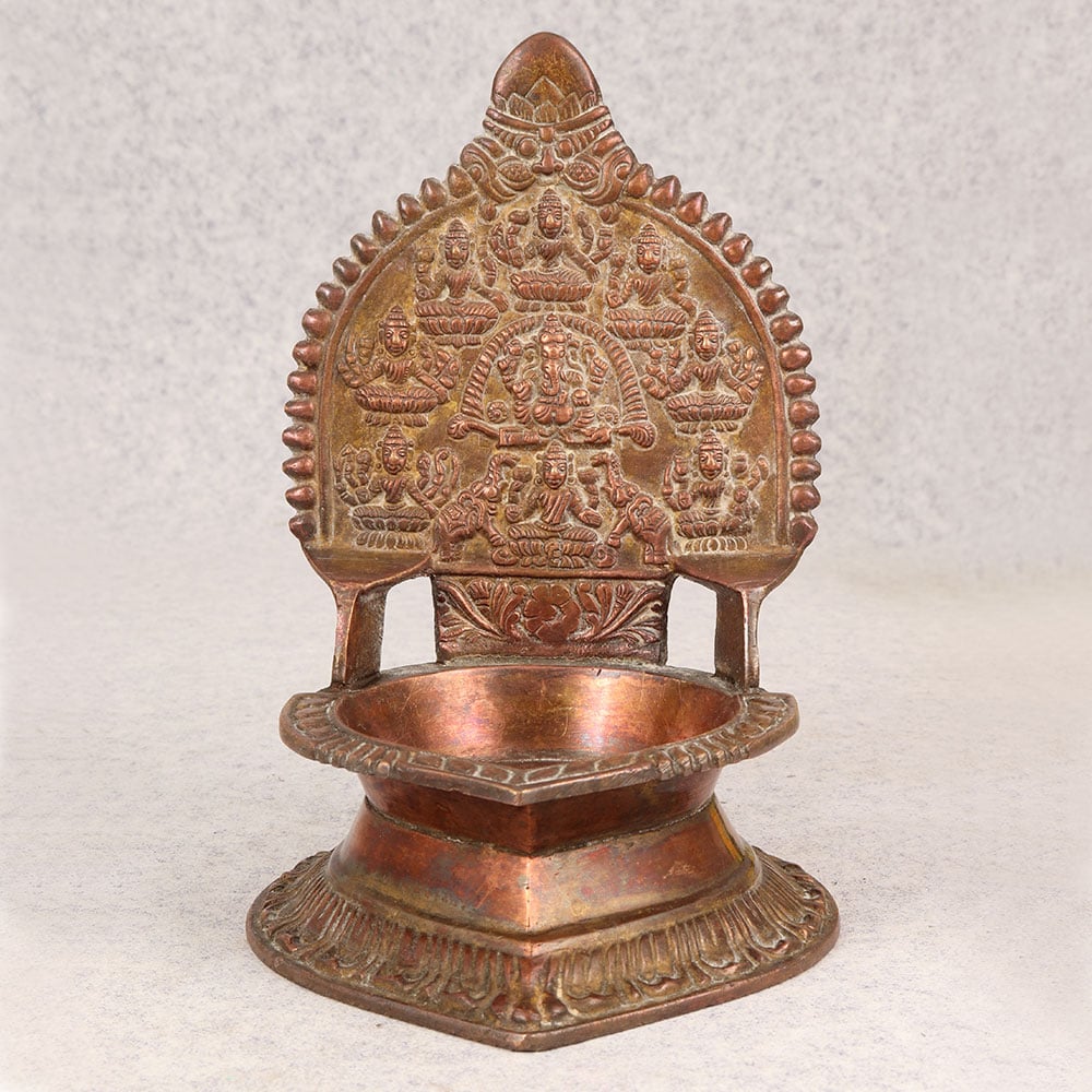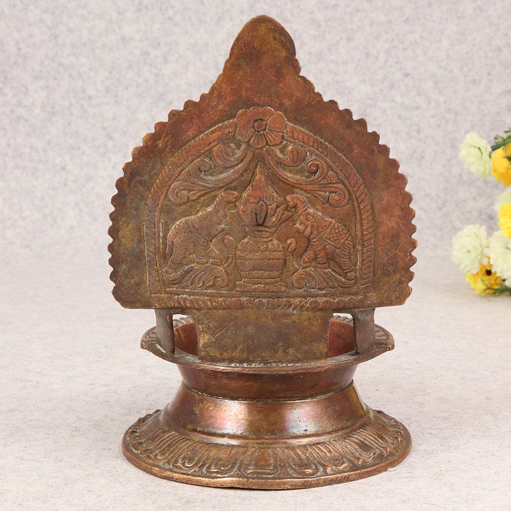 Buy a Vintage Brass Gajlakshmi Oil Lamp online that is a radiant embodiment of spiritual elegance and craftsmanship. Handmade by highly skilled Indian artisans in the time-honoured South Indian Art tradition, this exquisite oil lamp captures the essence of devotion and artistic finesse. Crafted from high-quality brass, it boasts a rich antique brown finish, lending it a vintage charm that resonates with history. This Gajlakshmi oil lamp is designed for sacred moments of prayer and meditation, infusing your space with a divine aura. Its intricate detailing and traditional Gajlakshmi motif, symbolizing prosperity and auspiciousness, make it a meaningful addition to any home, office, restaurant, hotel, or cafe prayer room. The antique brown patina adds a touch of antiquity, transforming it into a captivating piece for collectors of vintage treasures. Whether enhancing your personal spiritual sanctuary or gifting it to loved ones on special, festive, or auspicious occasions, this brass oil lamp transcends its utilitarian purpose, becoming a cherished symbol of cultural heritage and timeless beauty.