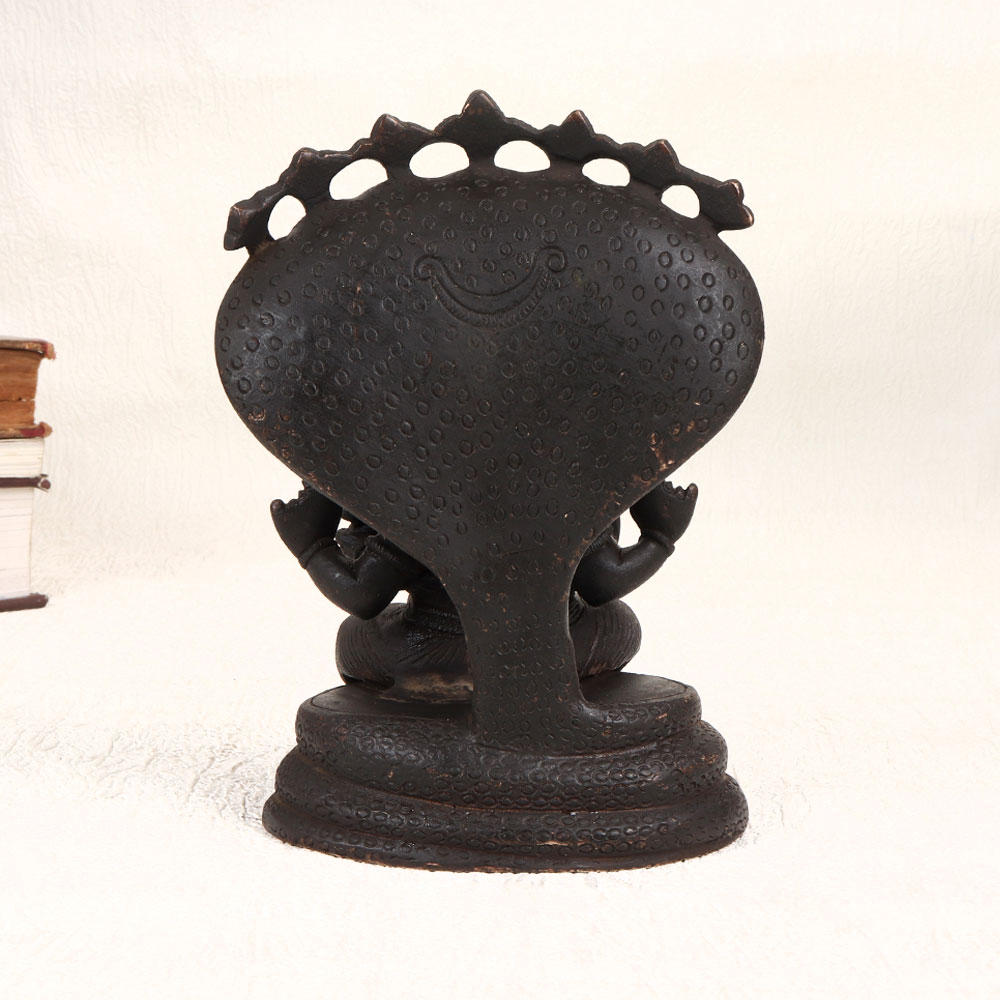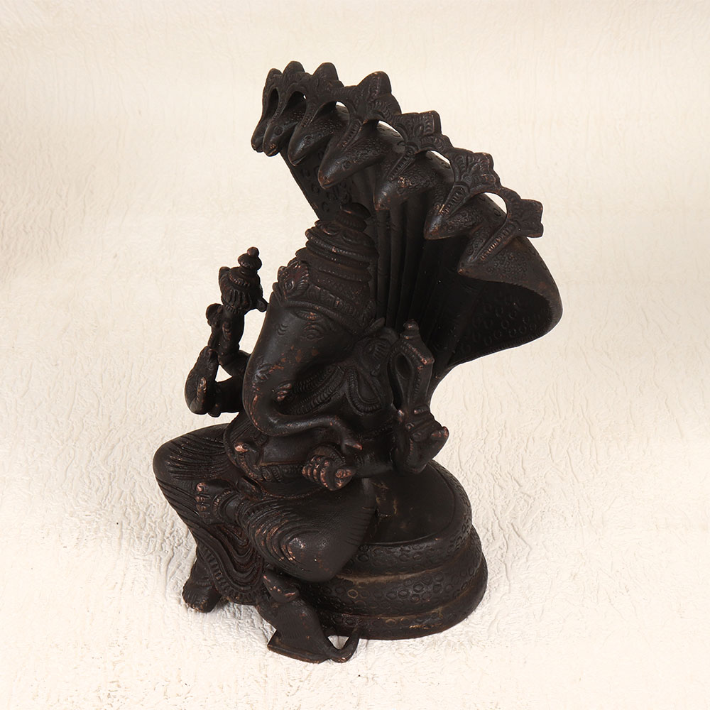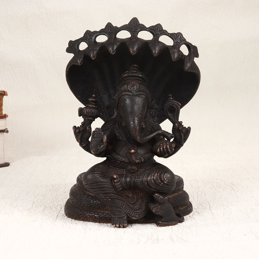Immerse your space in divine elegance with our exquisite vintage brass statue of Lord Ganesha seated gracefully under the protective canopy of Sheshnag. Handcrafted by skilled Indian artisans in the time-honoured tradition of South Indian Art, this masterpiece exudes timeless charm with its dark finish. Crafted from high-quality brass, each detail is meticulously shaped, showcasing the artisan's dedication to perfection. This captivating Lord Ganesha statue is versatile, adding a touch of spirituality to your home, office, restaurant, hotel, or cafe prayer room. Its intricate design and vintage allure make it an ideal decorative piece, seamlessly blending tradition with sophistication. Elevate your collection of vintage treasures or present it as a thoughtful gift to your loved ones on special, festive, or auspicious occasions.