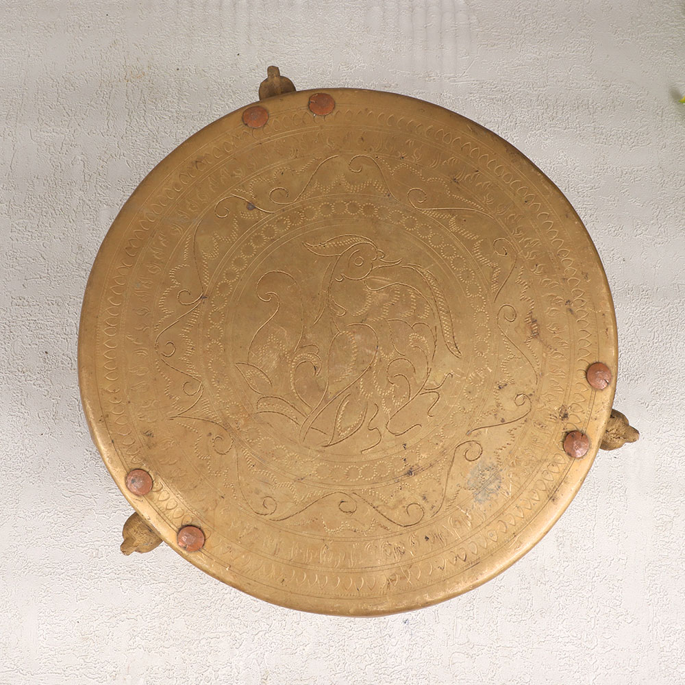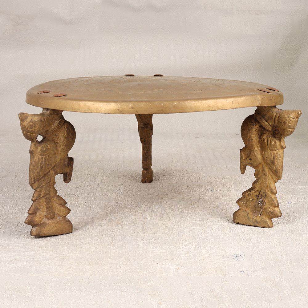 Buy a Small Brass Table online that is a testament to the craftsmanship of talented Indian artisans steeped in the rich heritage of South Indian Art. Meticulously handcrafted, this table stands as a symbol of tradition and artistry, showcasing a seamless blend of elegance and functionality. The table's three legs are intricately designed and feature beautiful engravings that tell a story of cultural significance. Its antique brown finish adds a touch of vintage charm, creating a timeless piece that effortlessly complements any interior. Crafted from high-quality brass, the table boasts durability and a luxurious aesthetic, making it a versatile addition to your home, office, restaurant, hotel, or cafe. This masterpiece serves not only as a functional piece of furniture but also as a captivating decoration, enhancing the aesthetic appeal of any space. Whether adorning your living room, office lobby, or dining area, this small brass table is a conversation starter. Moreover, it serves as an exceptional gift for your loved ones on special, festive, or auspicious occasions. Give the gift of artistry and tradition with this handmade marvel that transcends time and resonates with cultural significance.
